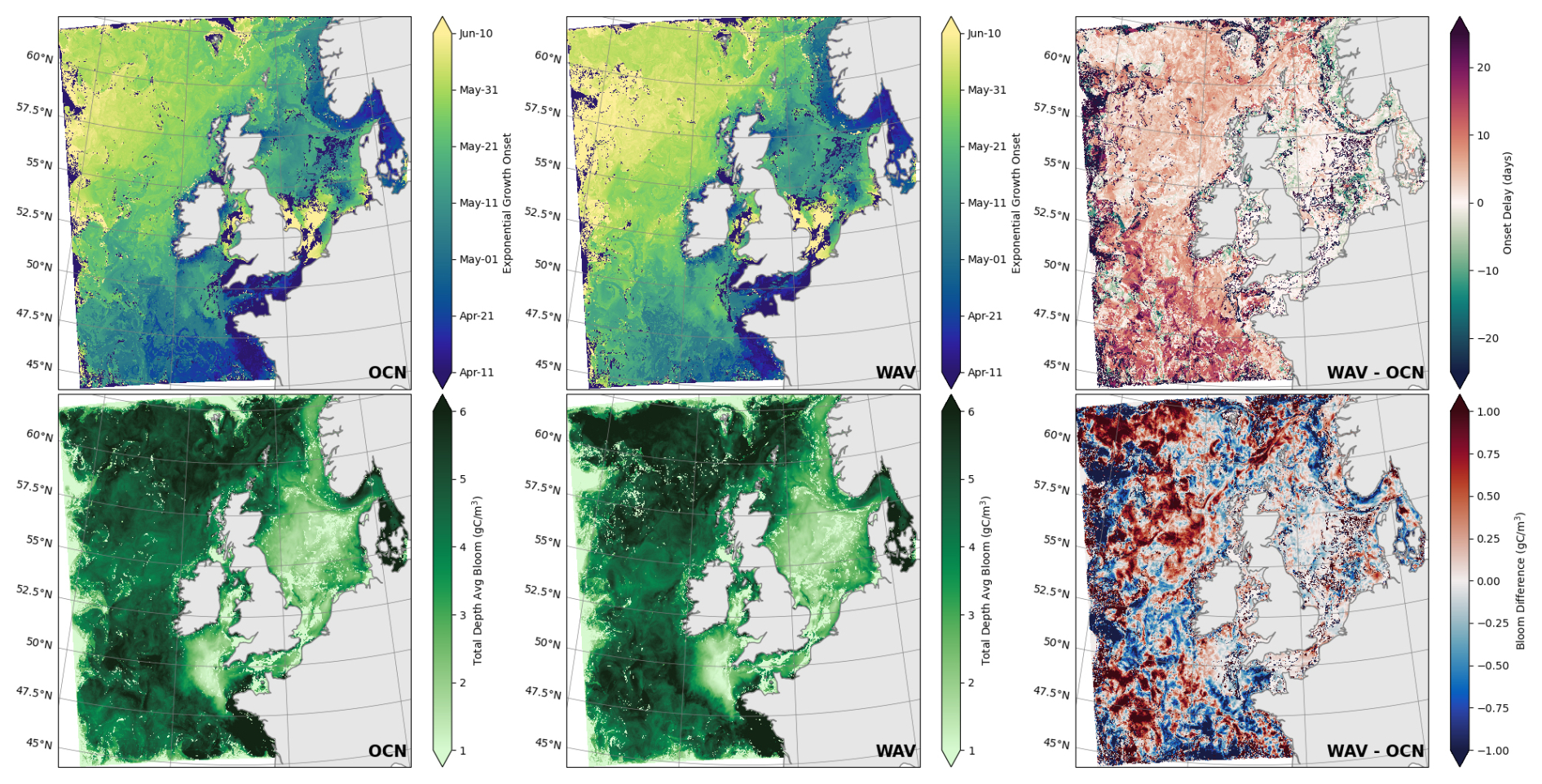 The study identified regional and seasonal variations in the response of phytoplankton to wave activity: during the bloom (in March–April in the observations, April–June in the model), with enhanced wave activity off-shelf or near the shelf break inducing mixing of the surface bloom down into deeper waters, and the chlorophyll concentration near the surface is reduced. On-shelf, enhanced wave activity tends to generally increase chlorophyll activity near the surface from July–September, likely because light is available throughout the water column, and wave mixing helps mix nutrients from rich to poor regions. This could either occur through advection of nutrient-rich river plumes or through vertical mixing if the injection of TKE is deep enough and nutrients are still available near the bottom of the sea, which is possibly not the case in May–June (Fig. 2).