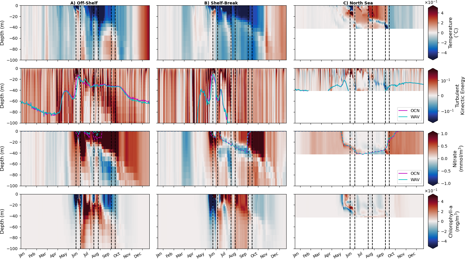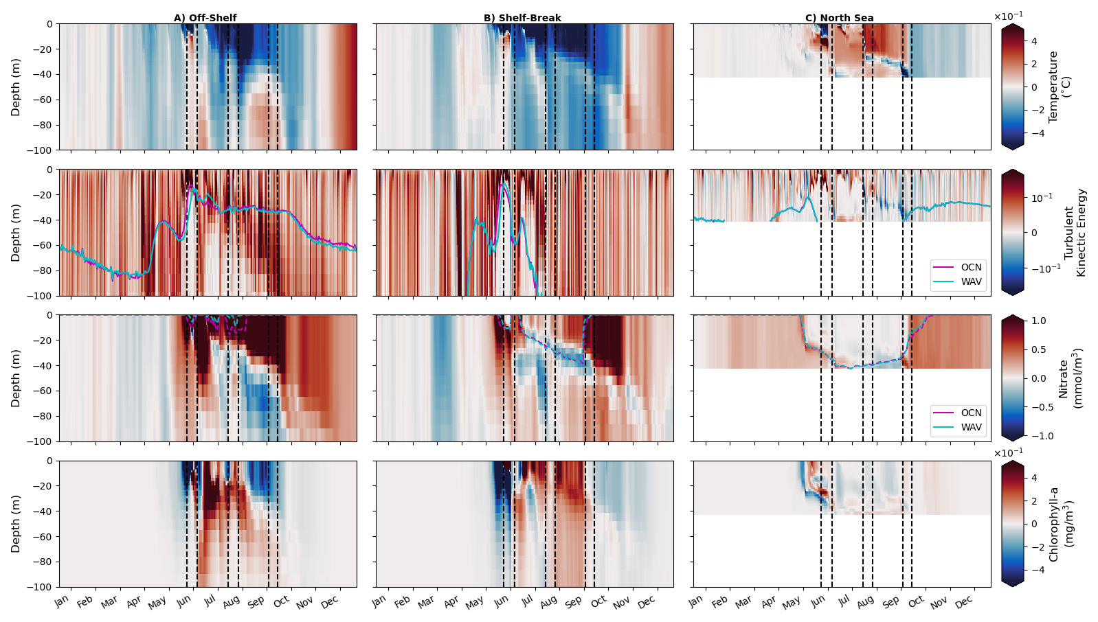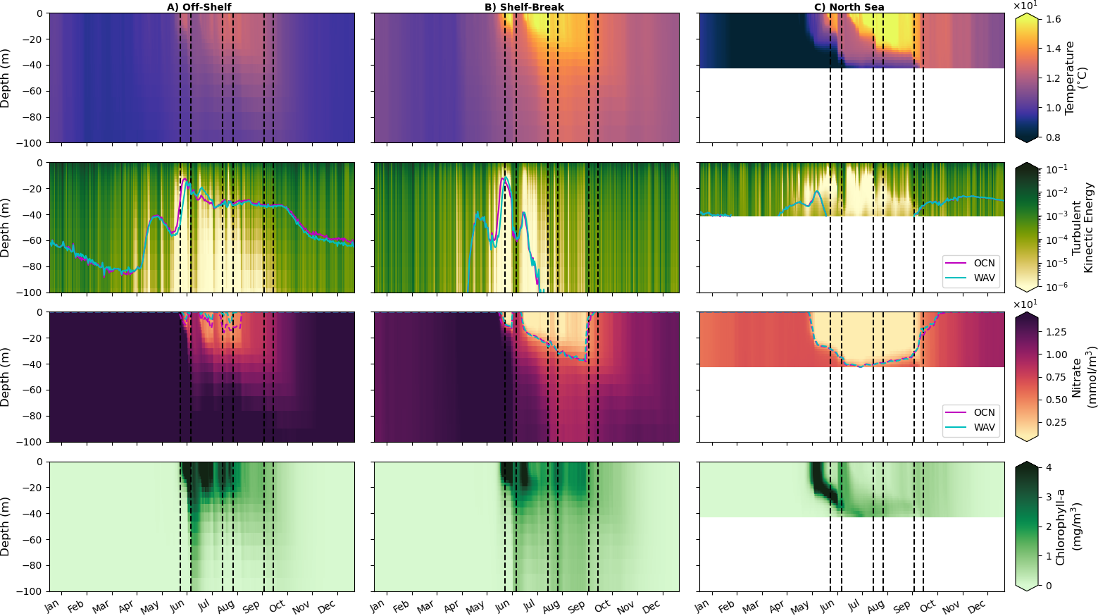 Figure 11Hovmöller plots (depth/time) of WAV output for potential temperature, turbulent kinetic energy, nitrate, chlorophyll and light availability for (left) off-shelf, (middle) shelf-break and (right) on-shelf North Sea regions defined in Fig. 1. Dashed lines indicate storm periods. The magenta (OCN) and cyan (WAV) time series show euphotic depth (1 % of surface light) in the second row and nutricline depth (3 µmol kg−1 threshold) in the third.