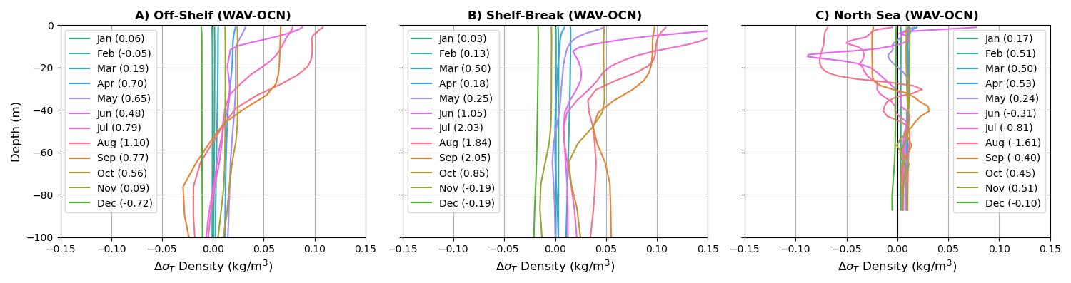 Figure 13Difference in density (kg m−3) stratification profiles in the upper 100 m throughout the year for the three regions. Density given in σT () coordinates, with the total difference throughout the column for each month shown in parenthesis.