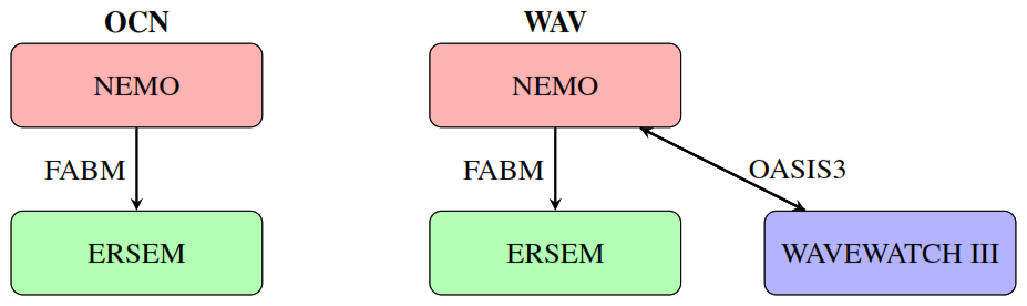 The impact of ocean-wave coupling on biogeochemistry is assessed through a twin experiment. Experiments are conducted with (WAV) and without (OCN) the coupled wave model in order to examine the biogeochemical response, as shown in Scheme 1.