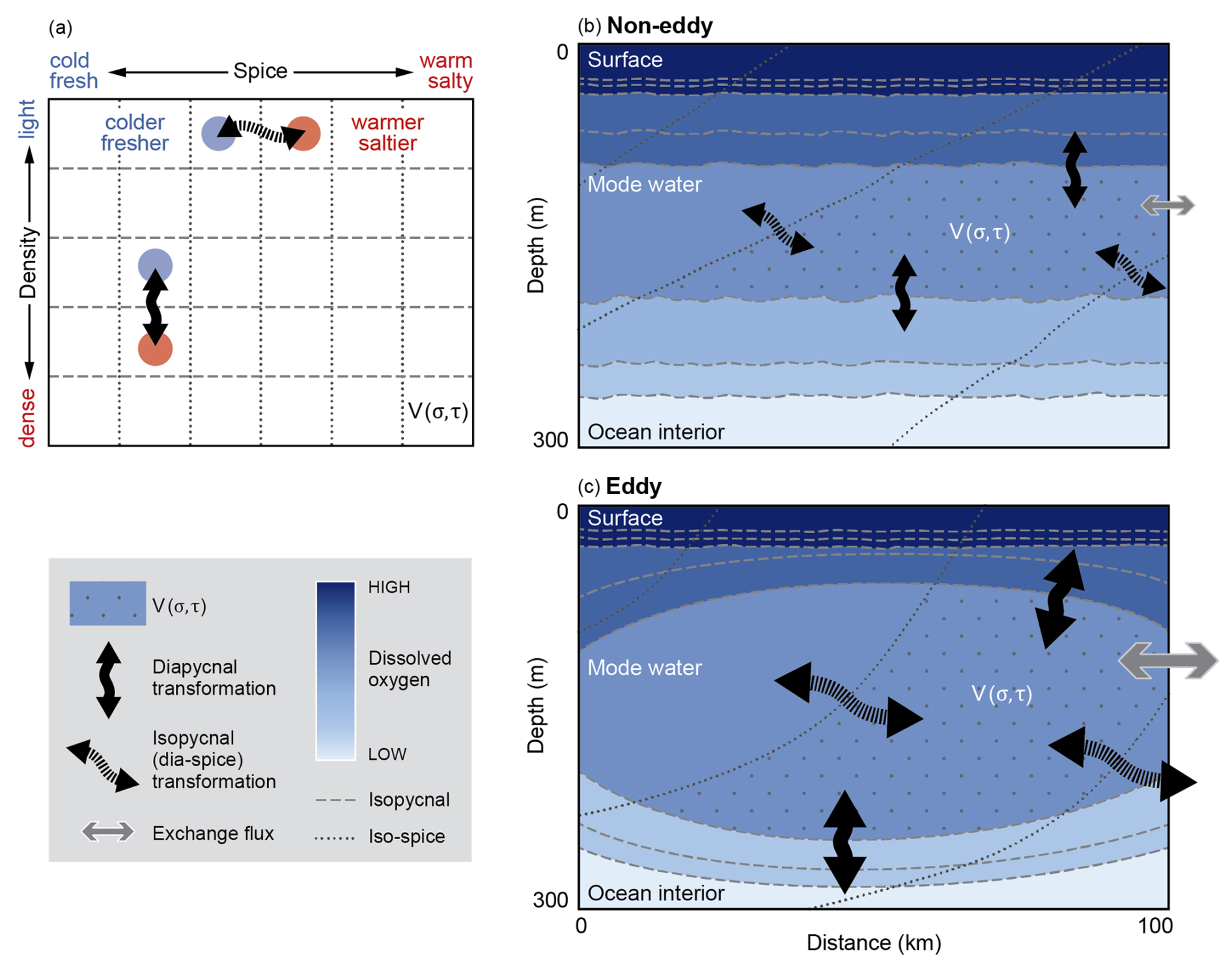 During eddy passages, all three components of the mode water volume budget-diapycnal, isopycnal transformations, and exchange flux – are significantly intensified compared to non-eddy conditions (as the schematic in Fig. 2 shows). Overall, our results demonstrate that transformation within the mode water layer is strongly enhanced by mesoscale activity. These findings underscore the need for sustained, high-resolution observations, as they would allow us to link integrated transformation rates more explicitly to underlying physical drivers, resolve the vertical structure of mixing processes, and assess the role of mesoscale and submesoscale dynamics and topographic interactions. Ultimately, combining transformation diagnostics with targeted in situ measurements will improve our ability to constrain ocean ventilation and tracer budgets, refine model parameterizations, and evaluate how these processes respond to a changing climate.