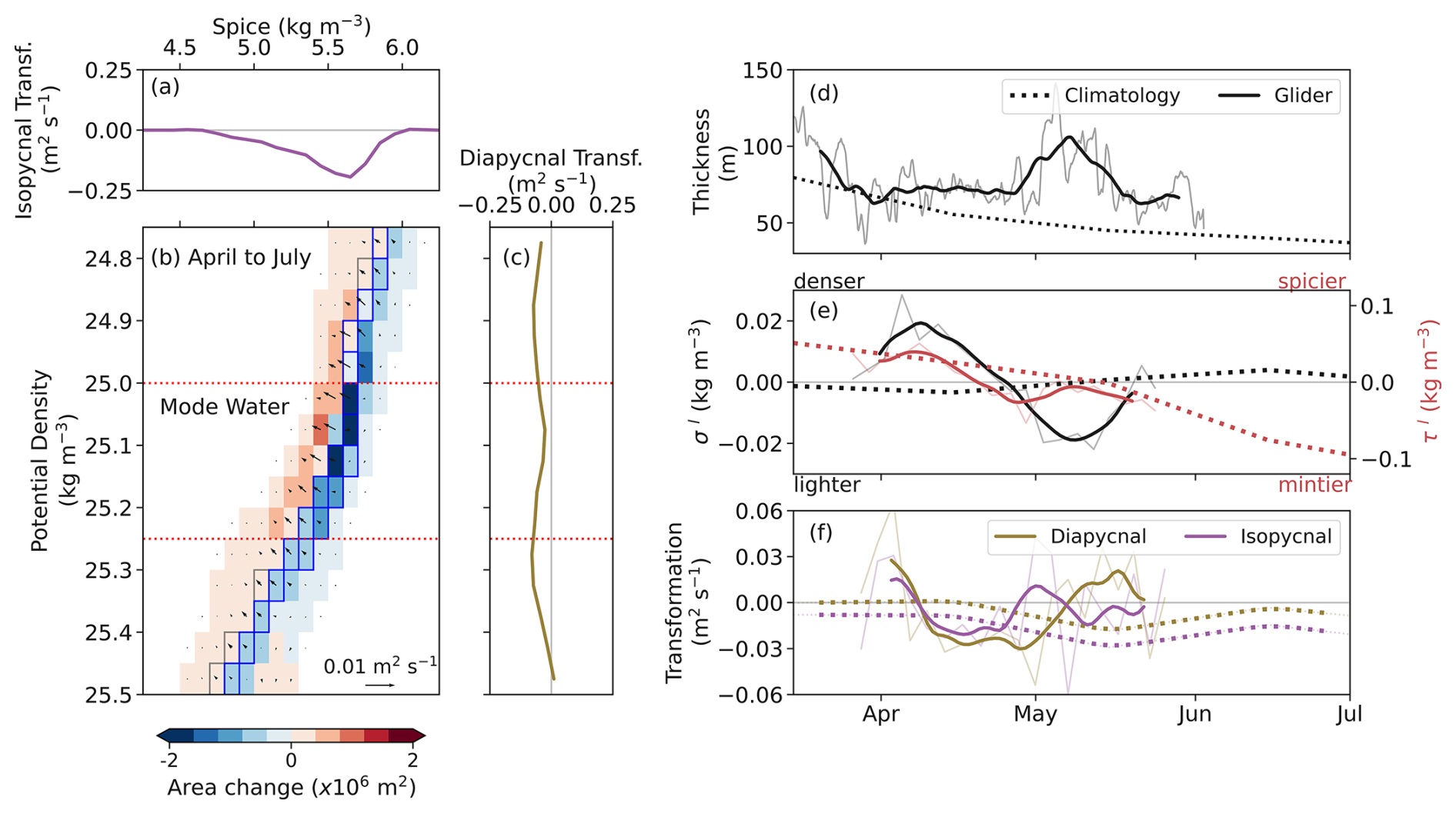 The previous analysis was based on monthly climatologies and, therefore, mesoscale and smaller scale contributions to the transformation are largely averaged out. In contrast to the climatological perspective, the high-resolution glider time series resolves submonthly variability and therefore reveals the episodic, intraseasonal changes in mode water structure and transformations that are absent from the monthly climatology. This allows us to directly quantify short-lived events associated with transient processes, such as mesoscale eddies. Over shorter timescales, the high-resolution time series provided by the ocean gliders offers a unique view that highlights the large variability of mode water thickness and depth due to eddy presence and topographical interactions with the shelf break (Figs. 1e and 3d). We observe a transition toward mintier waters throughout the study period ( per month), albeit with notable temporal variability as indicated by the sign changes in the isopycnal transformation (Fig. 3e and f). Until early April, waters become spicier (isopycnal transf.>0). Then, they shift to mintier conditions (isopycnal transf.<0), which last until the end of April. After that, waters get spicier again. This behaviour reverses in mid-May, and the period ends with mintier waters (isopycnal transf.<0). A similar pattern is observed in the diapycnal transformation. Over the sampled period, waters get slightly lighter (Δσ=0.001 kg m−3 per month) but with large variability ( kg m−3, Fig. 3e). Densification occurs until early April (diapycnal transf.>0), followed by a period of lightening (diapycnal transf.<0), and a shift to densification after mid-May (diapycnal transf.>0, Fig. 3e). Notably, the isopycnal and diapycnal transformations are well correlated through most of the period until they begin to diverge in late April, when the isopycnal transformation changes sign approximately two weeks before the diapycnal transformation (Fig. 3f).