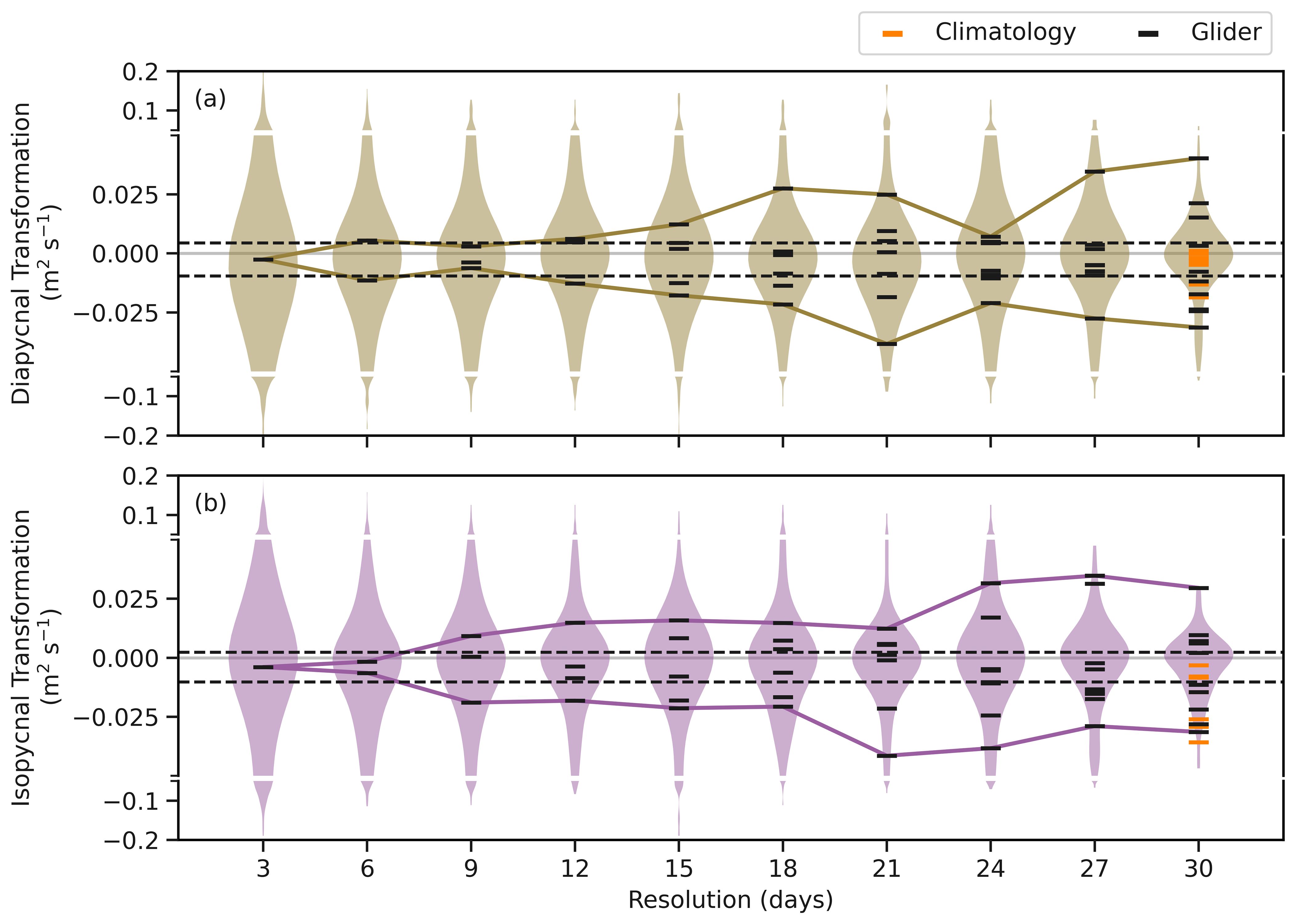 Figure 4Sensitivity of mean transformation estimates to sampling resolution. (a) Diapycnal and (b) isopycnal transformations distribution after smoothing the transformation with a resolution-day rolling mean as violin plots. Lines (–) indicate mean transformations estimated from sub-sampling the 3 d time series at coarser intervals (resolutions): black for the glider dataset, and orange for the climatological dataset. The coloured line envelopes the minimum and maximum mean transformations from sub-sampling the time series, and the black dashed lines indicate the transformations within the mean ±1 standard error of the highest resolution (3 d).