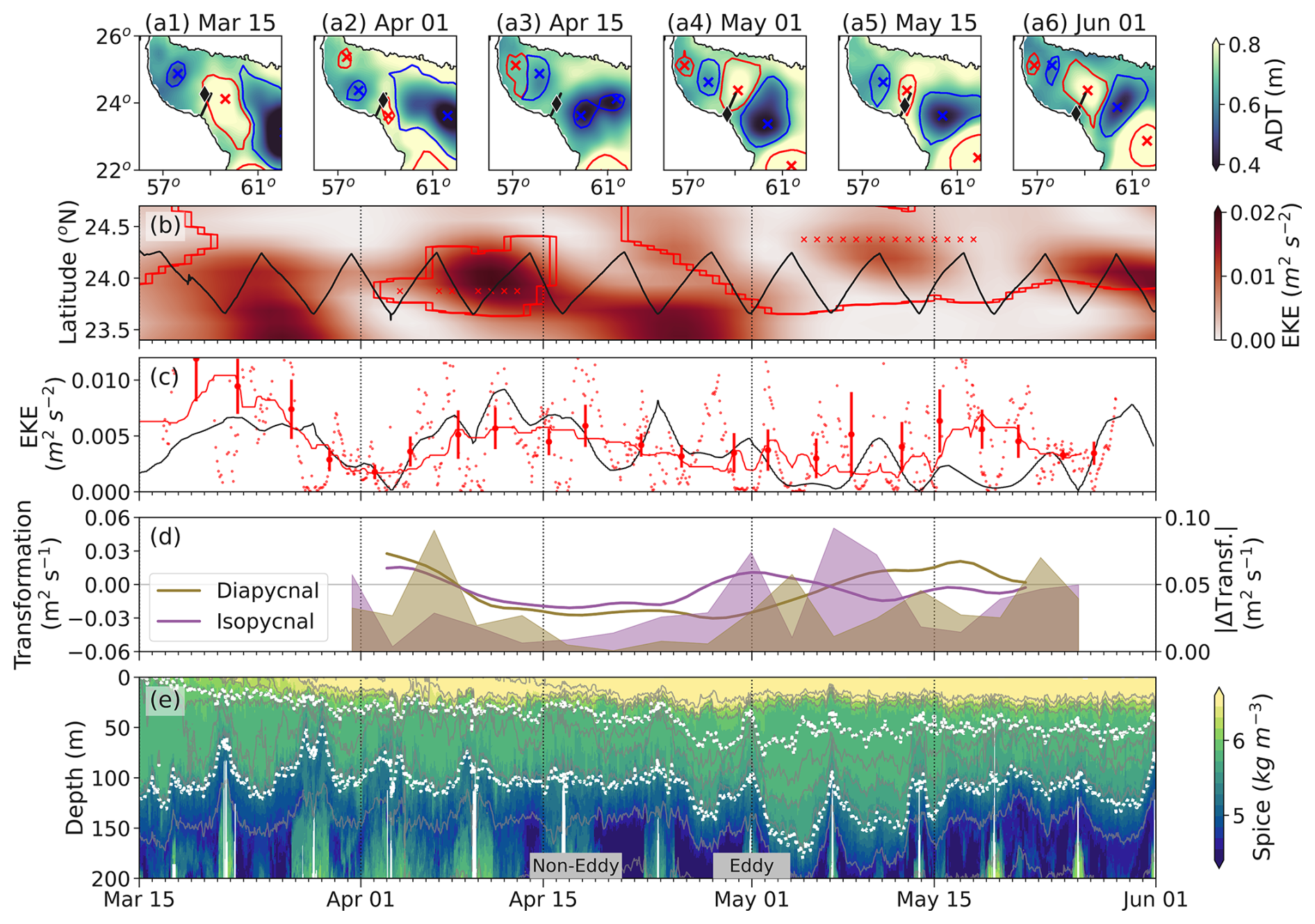Figure 5Mesoscale eddies and mode water transformation. (a1–a6) Snapshots of Absolute Dynamic Topography (ADT) in the Sea of Oman on the 1st and 15th day of each month between March and June. The glider location on each date is marked with a black diamond, and its transect is shown as a black line. The eddies are retrieved from TOEddies Atlas (anticyclones in red, cyclones in blue): the eddy center (×) and the maximum extent (solid contour) are also shown. (b) Hovmoller of EKE from satellite-derived geostrophic velocities with the glider track in black. The eddy center (×) and the contours of maximum extent (solid contour) are shown as in panel (a). (c) EKE retrieved from the glider dive-average current (small red dots), after applying a 24 h rolling mean (red line), and average per transect (large red dots) with the standard deviation for the transect as a vertical red line. EKE retrieved from ADT (black line), scaled by a factor of 2 to match the magnitude of the EKE from the glider. (d) Mean transformation per transect (left axis), and the absolute change of transformation over time (; right axis) to show when the change in transformation occurs for both diapycnal and isopycnal transformation. (e) Spice time series with the top and bottom boundaries of the core of the mode water (25–25.25 kg m−3; white dotted lines) and isopycnals (gray lines). The two labels show the periods chosen as “Eddy” and “Non-Eddy” study cases in Fig. 6.