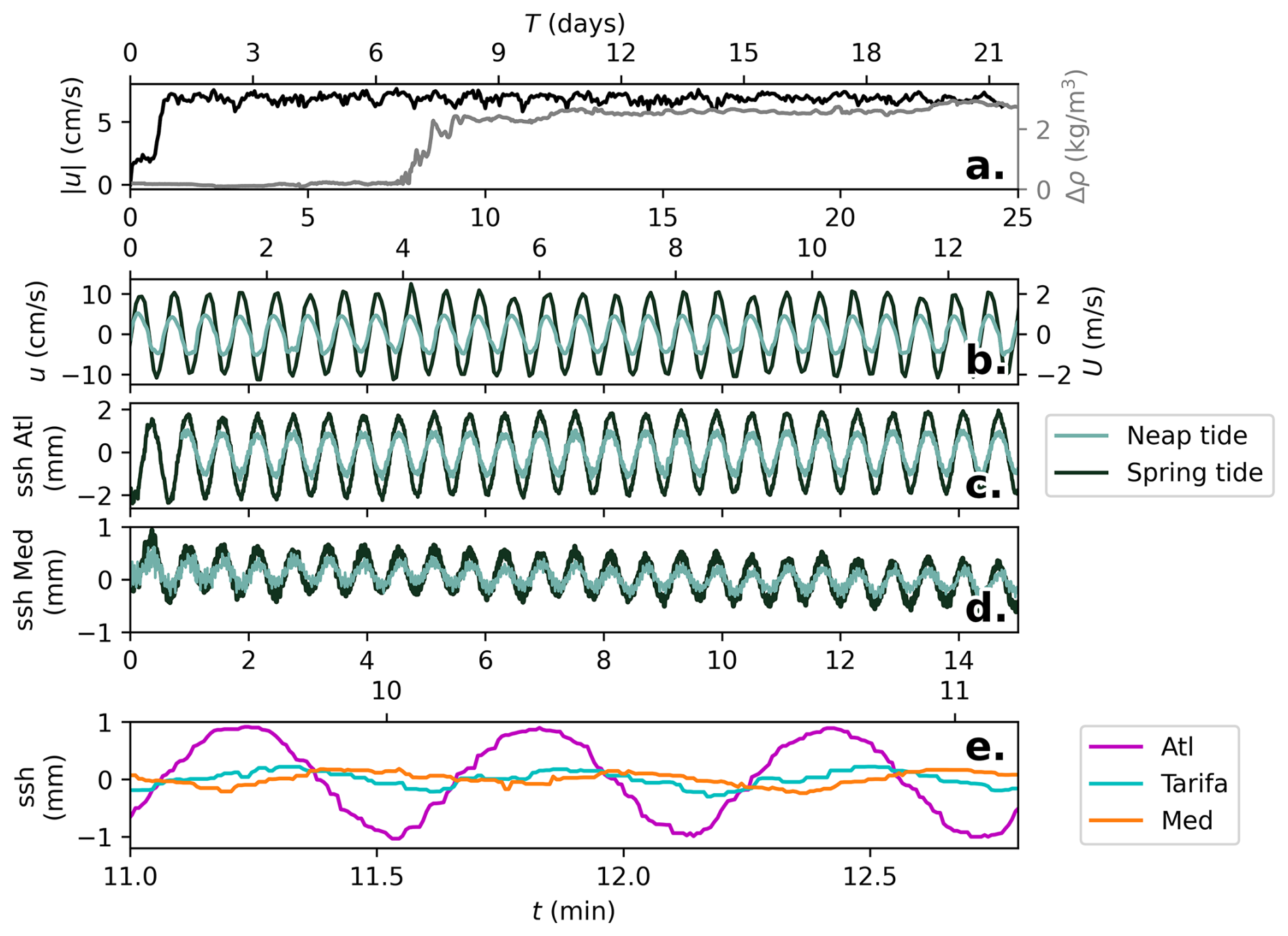 Figure 2(a) Time evolution of the baroclinic velocity (black line) measured using an ADV at the CS summit within the Mediterranean layer 1.6 cm (40 m in the ocean) from the bottom, highlighting the rapid initial settling of the maximal exchange regime, which lasts up to 14 rotational days. The grey line is relative to a density measurement off of Faro (Portugal) along the continental shelf using a CTD-F probe 1 cm (25 m in the ocean) from the bottom, highlighting the time for the Mediterranean Outflow needed to reach the Portugal coast at the end of the topography, corresponding to roughly 6 rotational days. (b) Purely barotropic velocities measured with the ADV at the CS summit within the Mediterranean layer 2.6 cm (65 m in the ocean) from the bottom, being of maximum 10 cm s−1 in the spring tide configuration (black lines), and half in the neap tide configuration (green lines), with the corresponding SSH anomalies in the Atlantic (c) and in the Mediterranean (d) basins. (e) Comparison of the SSH anomaly over three tidal cycles for the Atlantic (purple line), the Mediterranean (orange line) and at Tarifa (cyan line), highlighting a phase shift between the Atlantic basin and the Tarifa station for the tidal amplitude of 0.2Ttide. Experimental units (bottom-left), real ocean units (top-right).