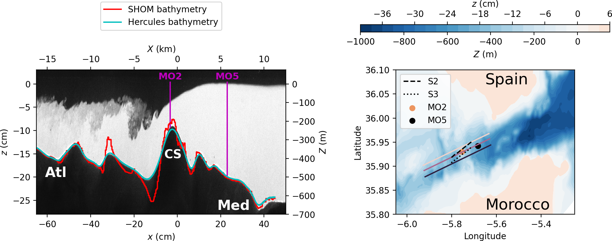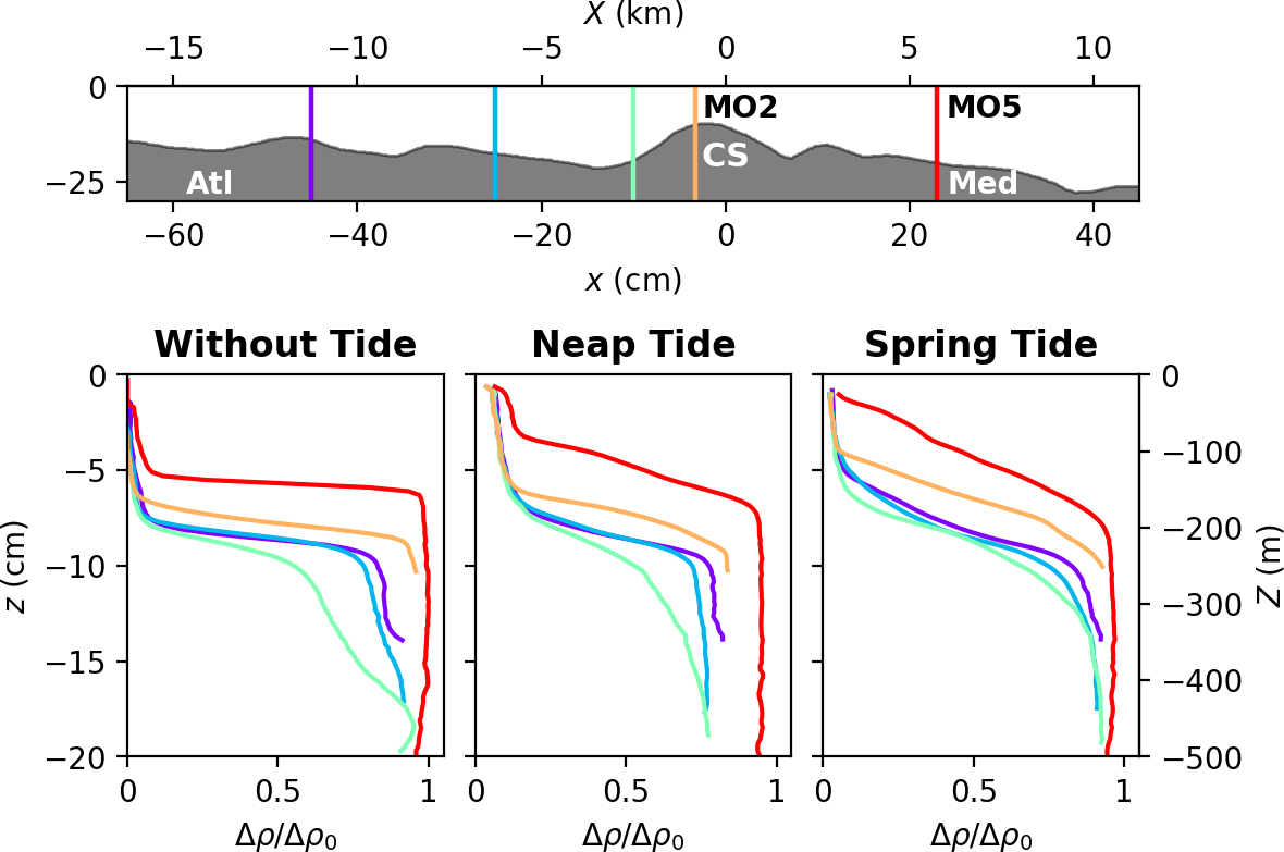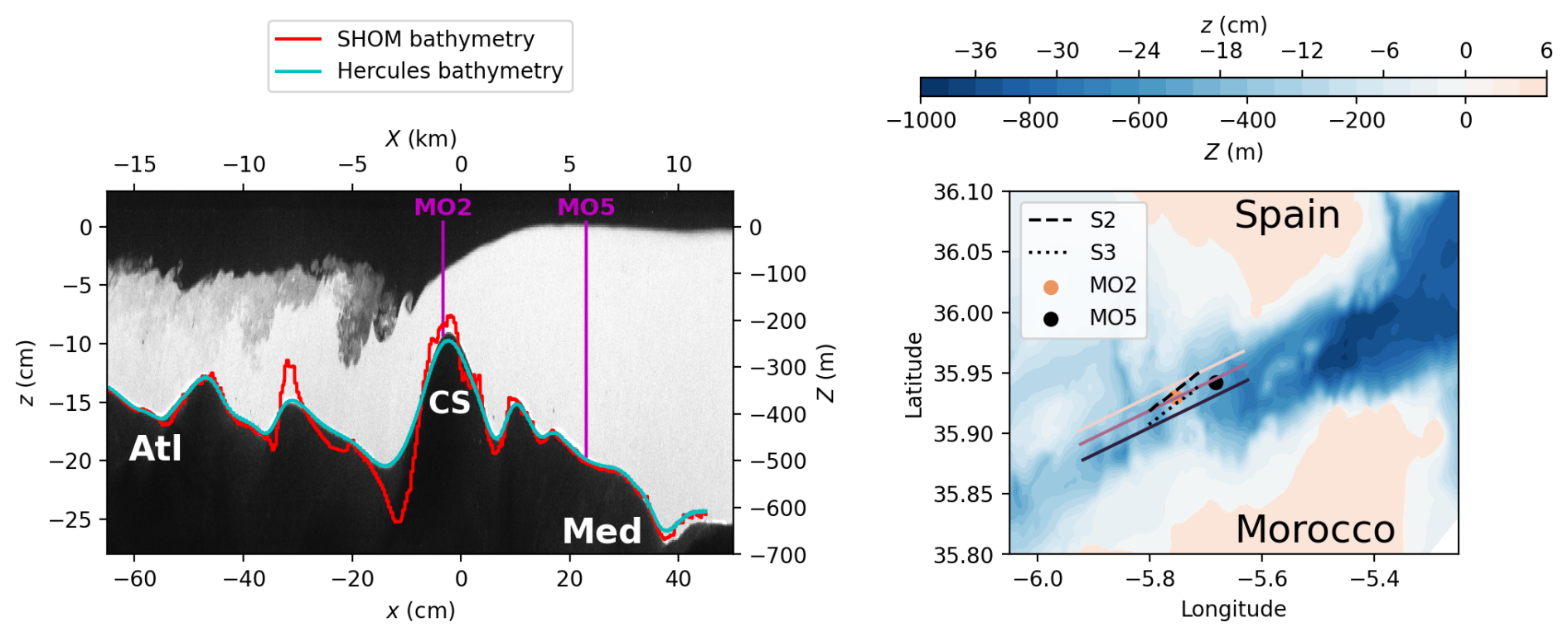 In the following sections, some experimental results are directly compared with in situ observations obtained during the PROTEVS GIB20 campaign (Bordois and Dumas, 2020) conducted by SHOM (Service Hydrographique et Océanographique de la Marine, the French Naval Hydrographic and Oceanographic Service). This large-scale intensive survey covered the Strait of Gibraltar, the Bay of Cadiz, and the Alboran Sea during a strong (near-equinox) fortnightly tidal cycle in October 2020. In this study, we focus on a subset of measurements collected at moorings MO2 and MO5, which were equipped with Conductivity–Temperature–Depth (CTD) sensors used to reconstruct the vertical density field and an acoustic doppler current profiler. Data collected along transects S2 and S3 included velocity profiles measured with vessel-mounted Acoustic Doppler Current Profiler (VMADCP), conductivity and temperature profiles measured with moving vessel profiler as well as acoustic backscatter measurements. The instrumentation and their main characteristics are described in detail in Roustan et al. (2023). The locations of the moorings and transects are shown schematically in Fig. 3b.