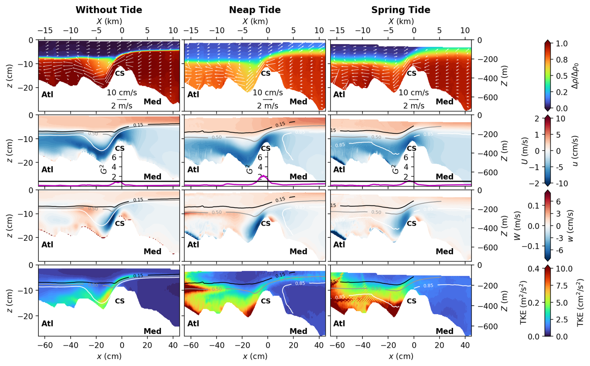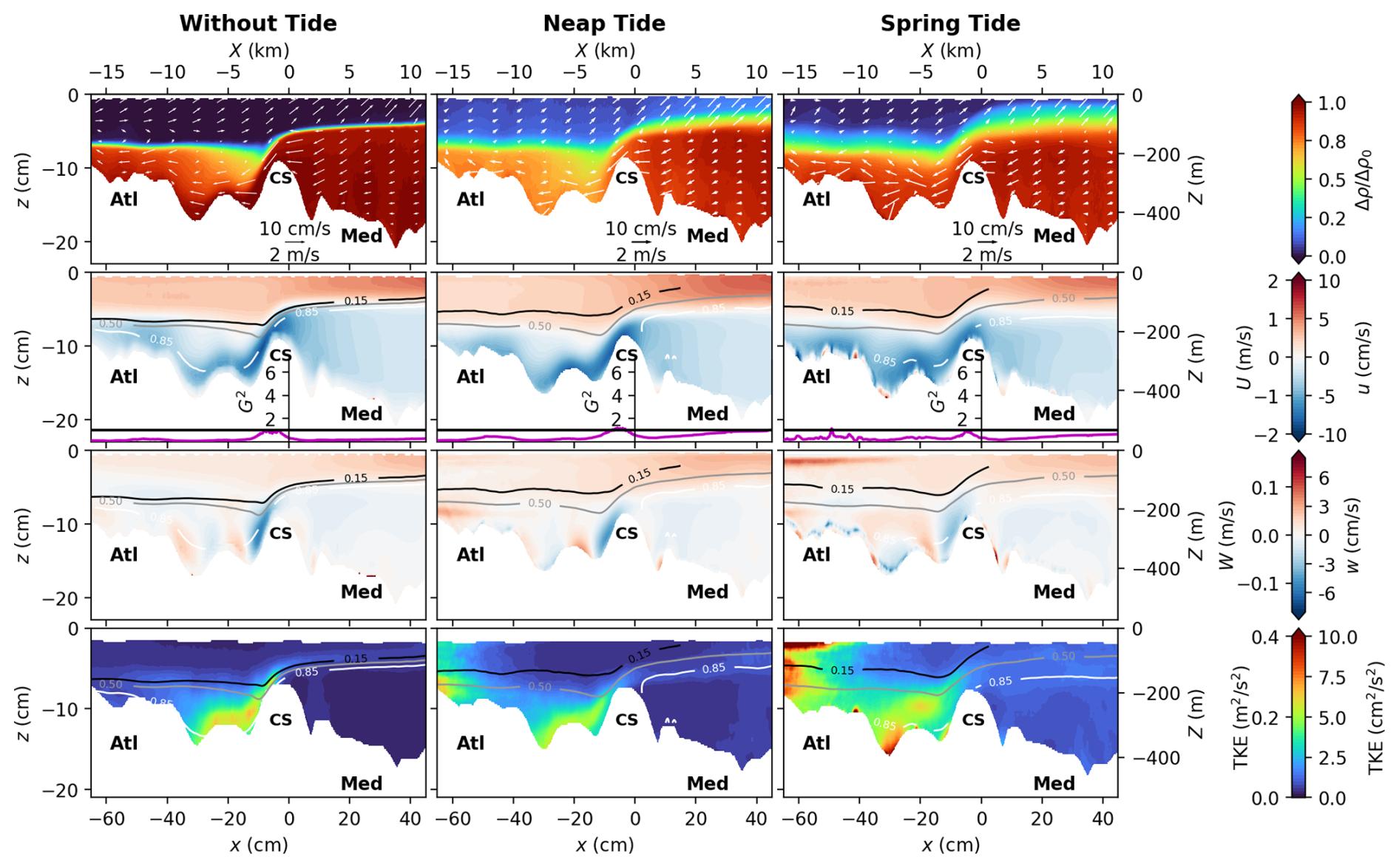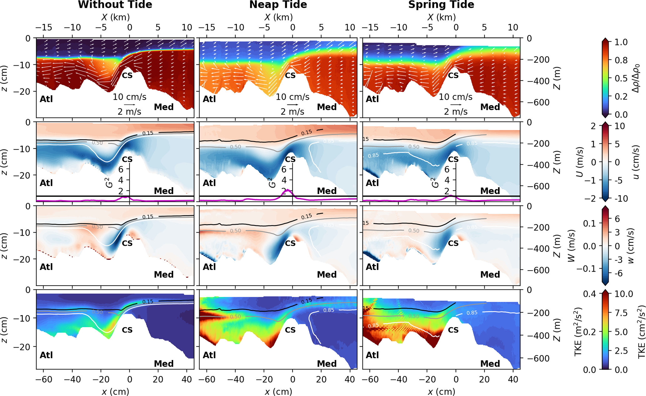 Figure 4Mean flow characteristics for the middle transect passing through the CS summit (cf. Fig. 3b), for the three tidal forcings: without tide, neap tide, and spring tide from left to right. The x axis represents the along-transect coordinate, being positive toward the east. The first row displays the mean dimensionless ratio of density differences , with being the averaged density over the seven considered tidal cycles. Averaged in-plane velocities are given by the white arrows. Note that the quiver plot is displayed with unequal vertical and horizontal scaling. Arrow angles are defined in data coordinates and the arrow length is determined solely by the in-plane speed. The second and third rows panels display the mean horizontal and vertical velocities, respectively, superposed with the .15, 0.5, and 0.85 (black, grey, and white lines respectively). In between, the time-averaged composite Froude number G2 is displayed as a purple line. The last row panels display the turbulent kinetic energy . Experimental units (bottom-left), real ocean units (top-right).