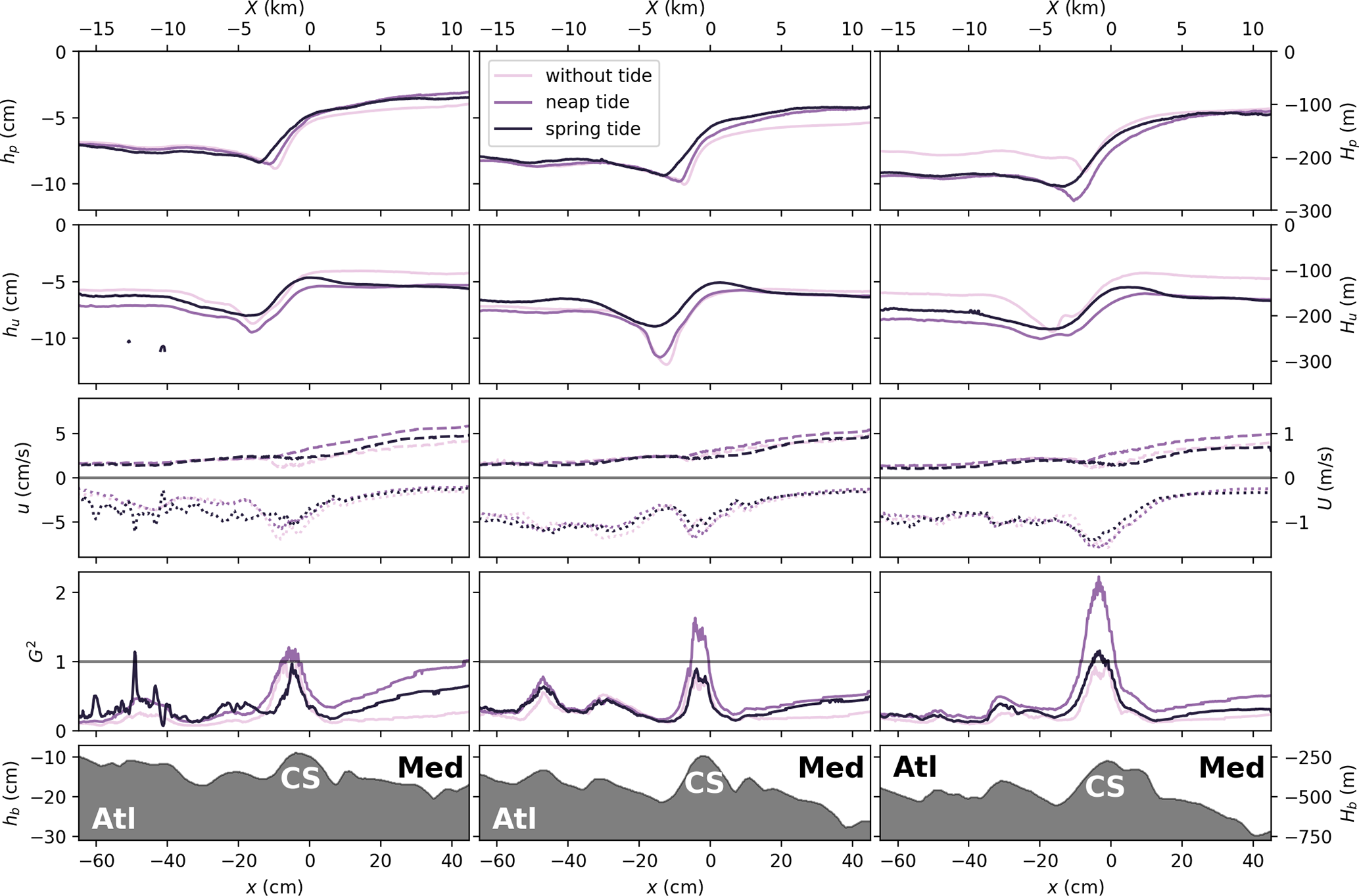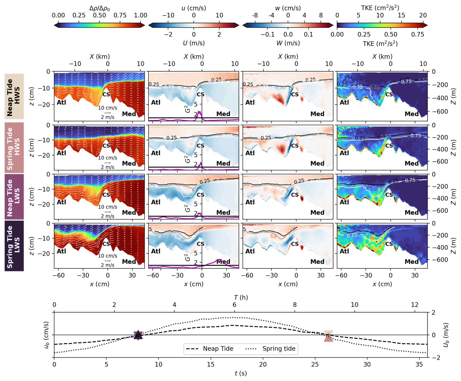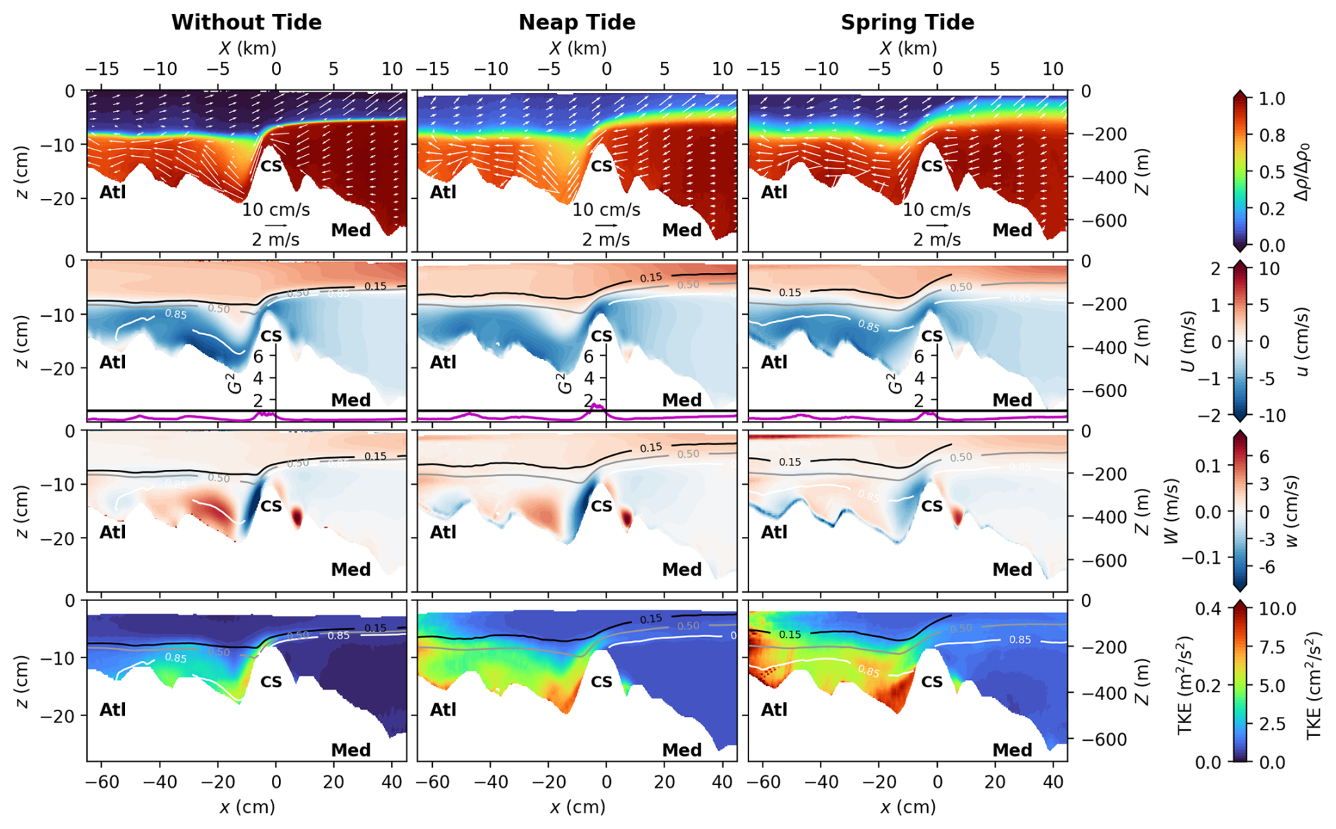 Figure 4Mean flow characteristics for the middle transect passing through the CS summit (cf. Fig. 3b), for the three tidal forcings: without tide, neap tide, and spring tide from left to right. The x axis represents the along-transect coordinate, being positive toward the east. The first row displays the mean dimensionless ratio of density differences , with being the averaged density over the seven considered tidal cycles. Averaged in-plane velocities are given by the white arrows. Note that the quiver plot is displayed with unequal vertical and horizontal scaling. Arrow angles are defined in data coordinates and the arrow length is determined solely by the in-plane speed. The second and third rows panels display the mean horizontal and vertical velocities, respectively, superposed with the .15, 0.5, and 0.85 (black, grey, and white lines respectively). In between, the time-averaged composite Froude number G2 is displayed as a purple line. The last row panels display the turbulent kinetic energy . Experimental units (bottom-left), real ocean units (top-right).