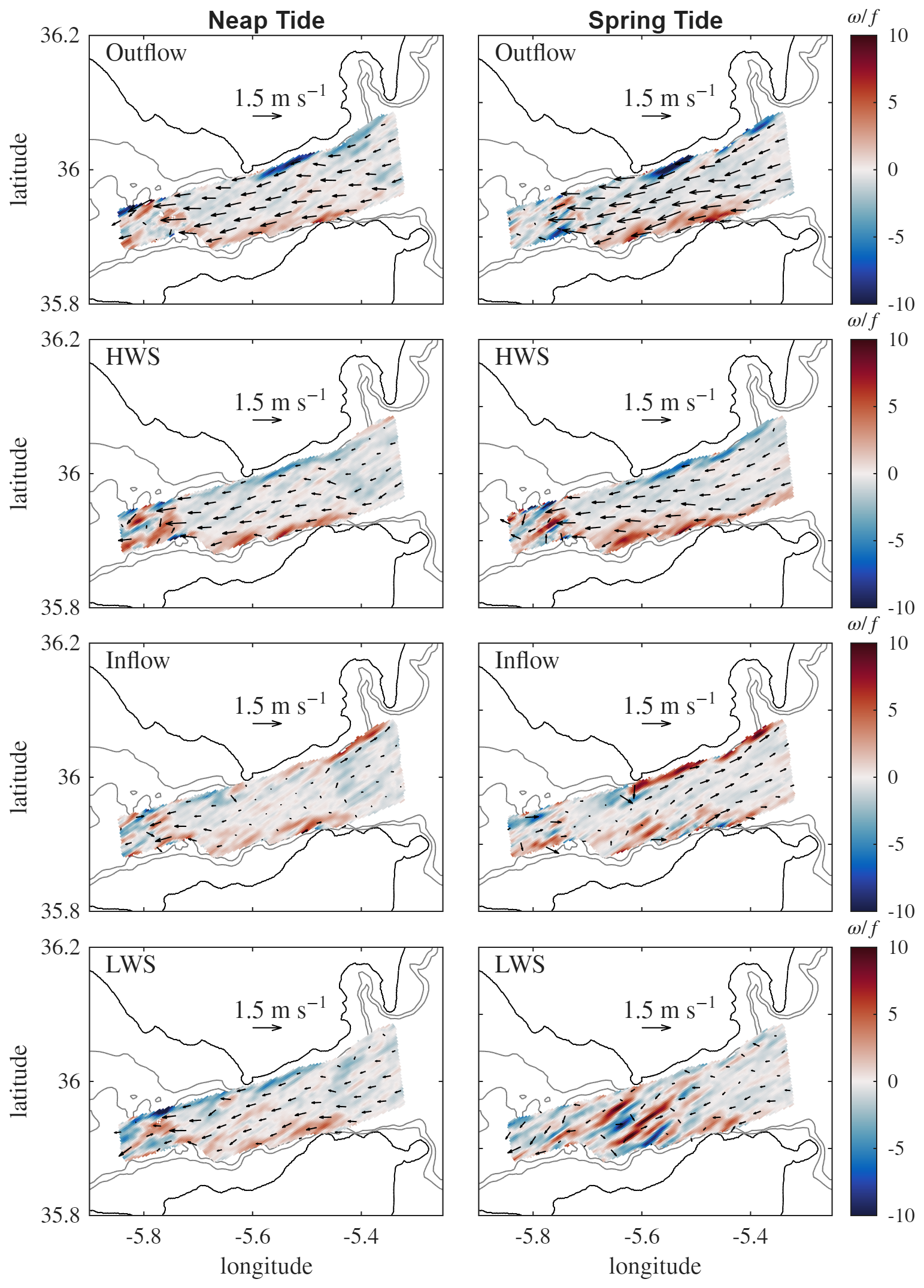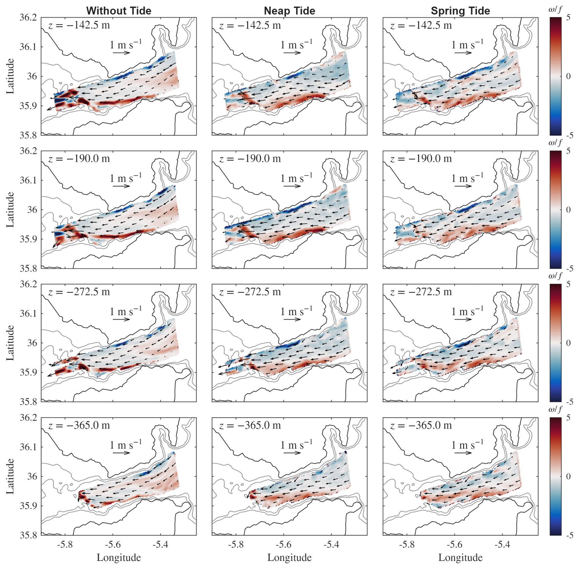 An overview of the averaged flow over four tidal cycles in the Strait at different depths (from −142.5 to −365 m) is shown in Fig. 5, for the considered three tidal conditions (without tide, neap tide, and spring tide from left to right). Horizontal velocities are displayed by the arrows, whereas the color fields indicate the relative vertical vorticity component ω, normalized by the Coriolis parameter f.