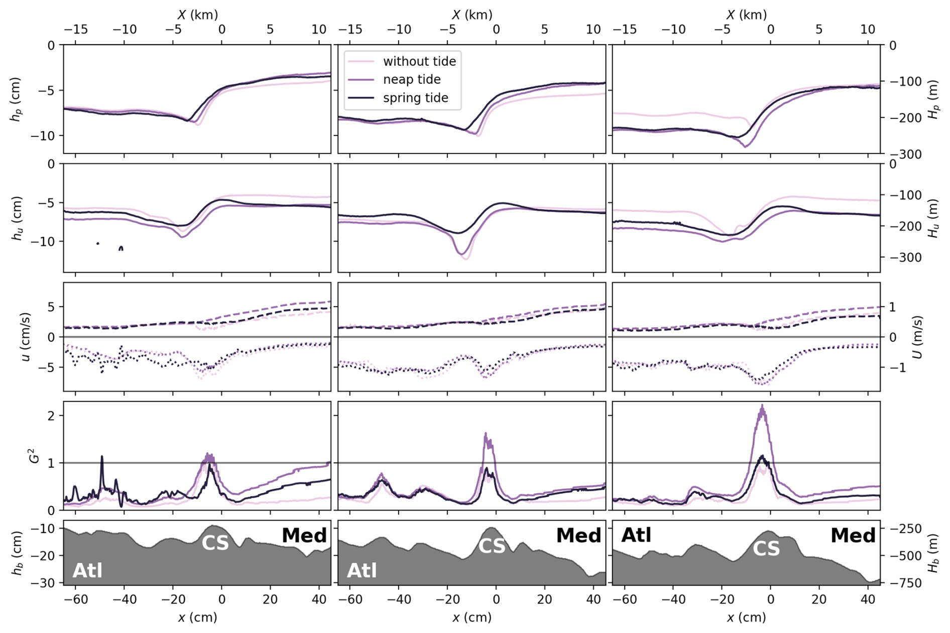 The composite Froude number G2, shown in Fig. 4 below the second row panels as a purple line, exhibits averaged values below unity everywhere and approaches unity at CS in all transects. Note that some uncertainty is present in the determination of G since velocity values close to the bottom boundary and the free surface are subject to more uncertainty and in some transects or tide conditions the upper layer velocities are sometimes missing close to the free surface. Hence, we expect our computed G2 being rather underestimated. These effects combined with the three-dimensional nature of the flow, which calls for a global criticality of the flow to be defined (Pratt, 2008), can explain the failure of the computed composite Froude number to capture regions in which G2⩾1 in the average. Note also that the presented values are a total temporal average: when computing the internal Froude number during a tidal cycle, values of G2⩾1 are captured, as it will be shown further below in Sect. 4.2. The same conclusions are also valid for the northern and southern transects given in Figs. B1 and B2, respectively, that are given in the Appendix.