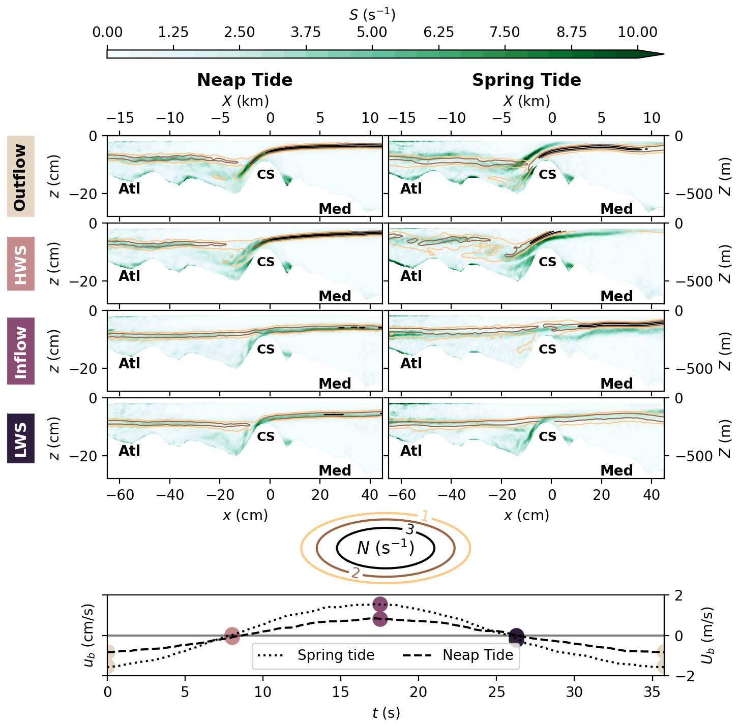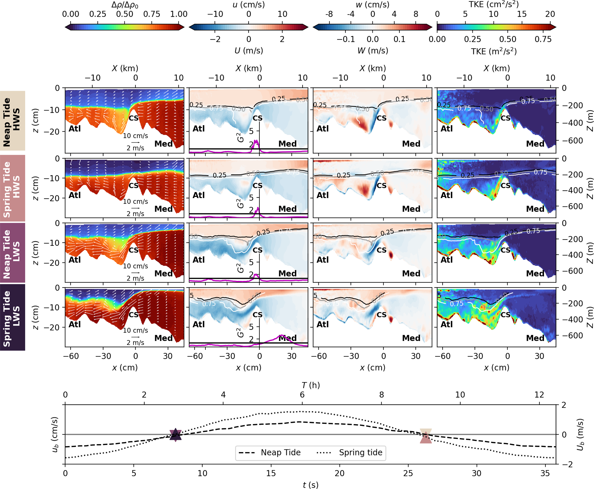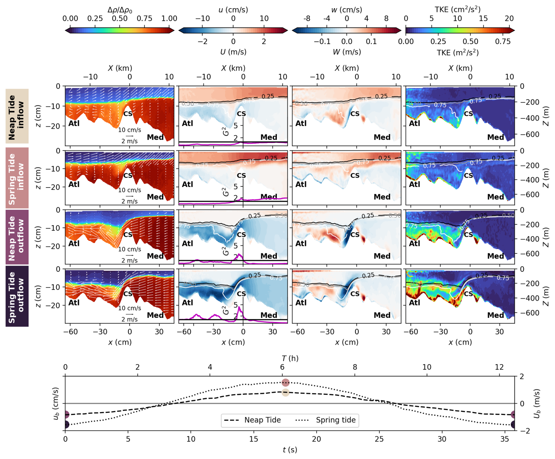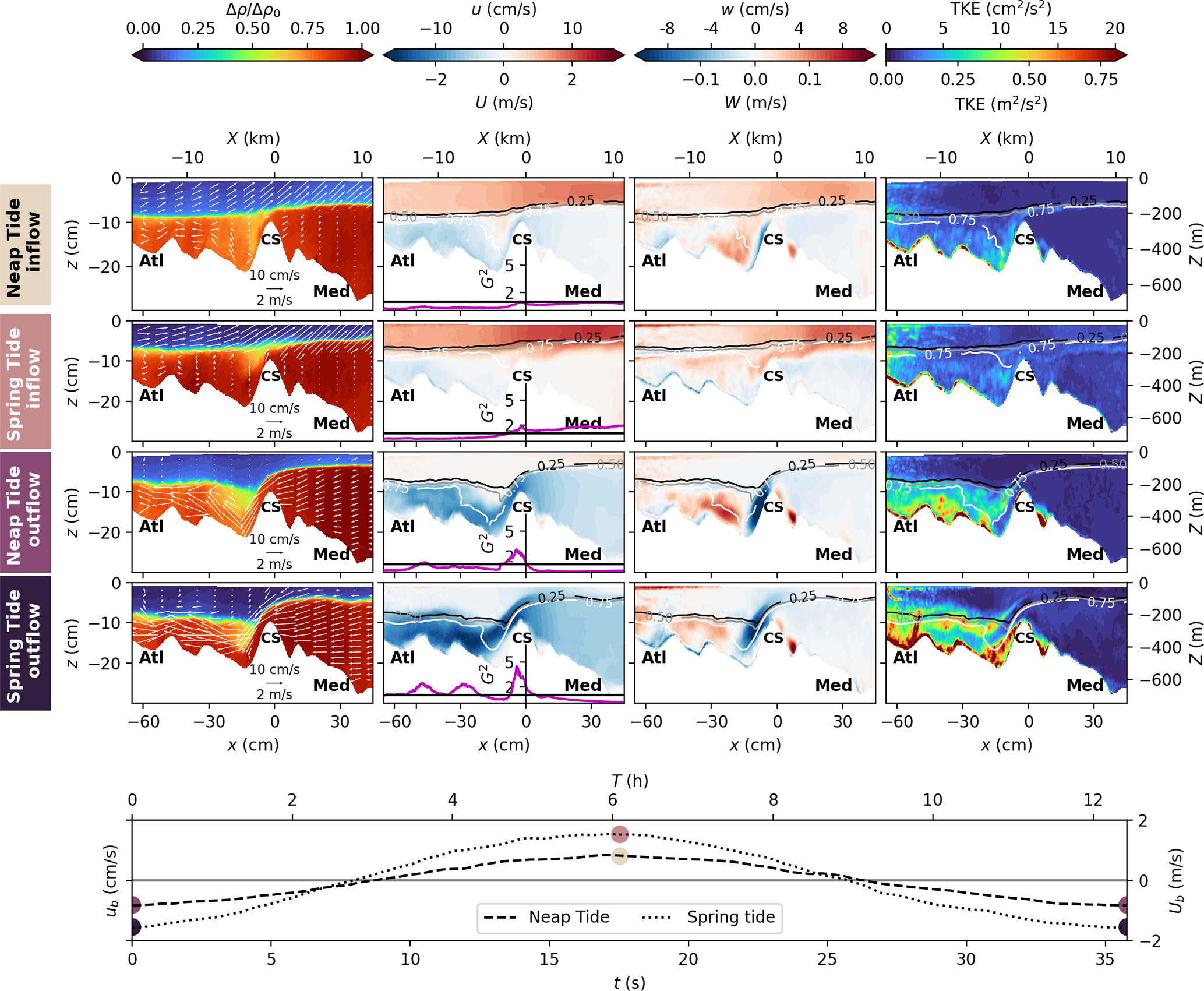 In the following Sect. 4.1, we first present time averaged velocity and density fields (, ), whereas the inflow and outflow dynamics during both spring tide and neap tide (, ) are analyzed in Sect. 4.2.