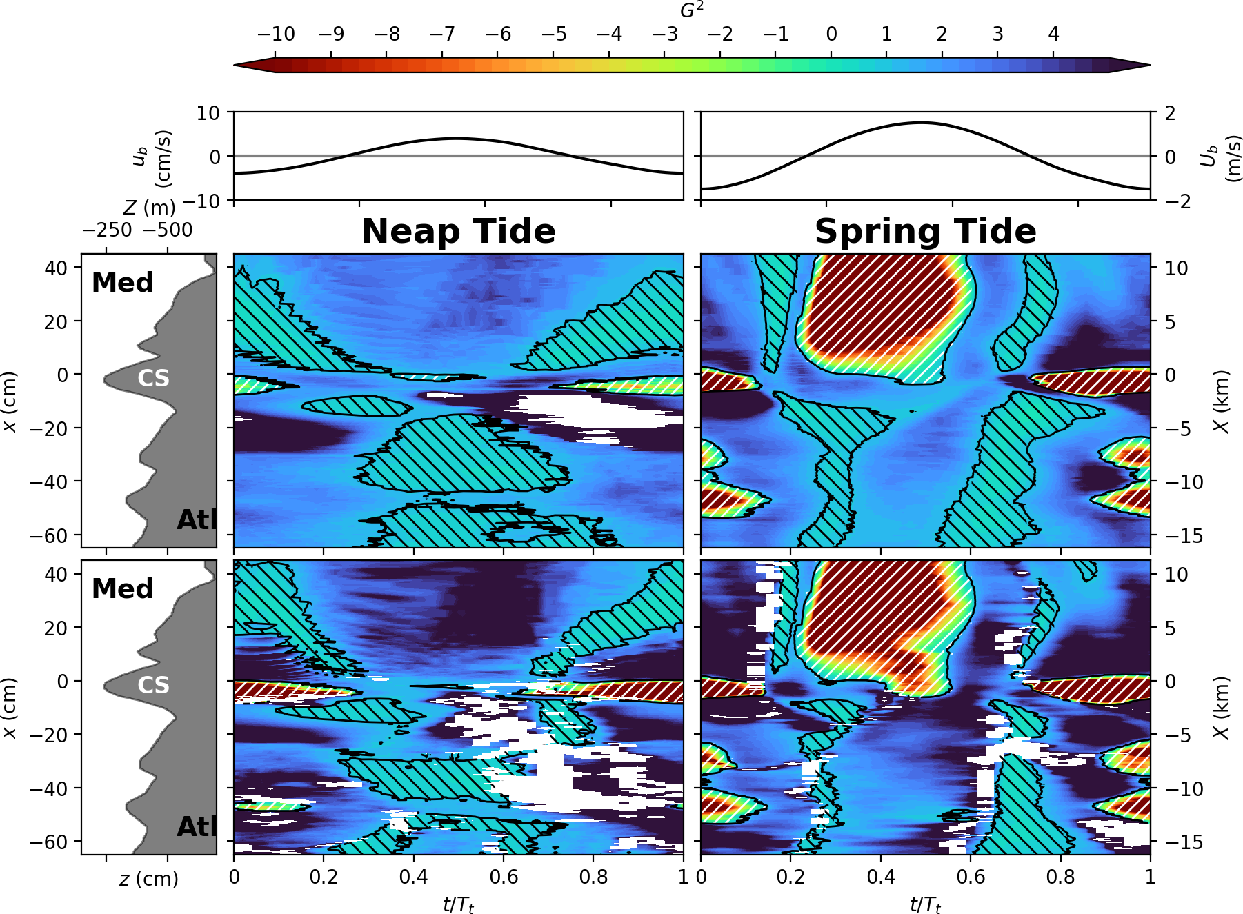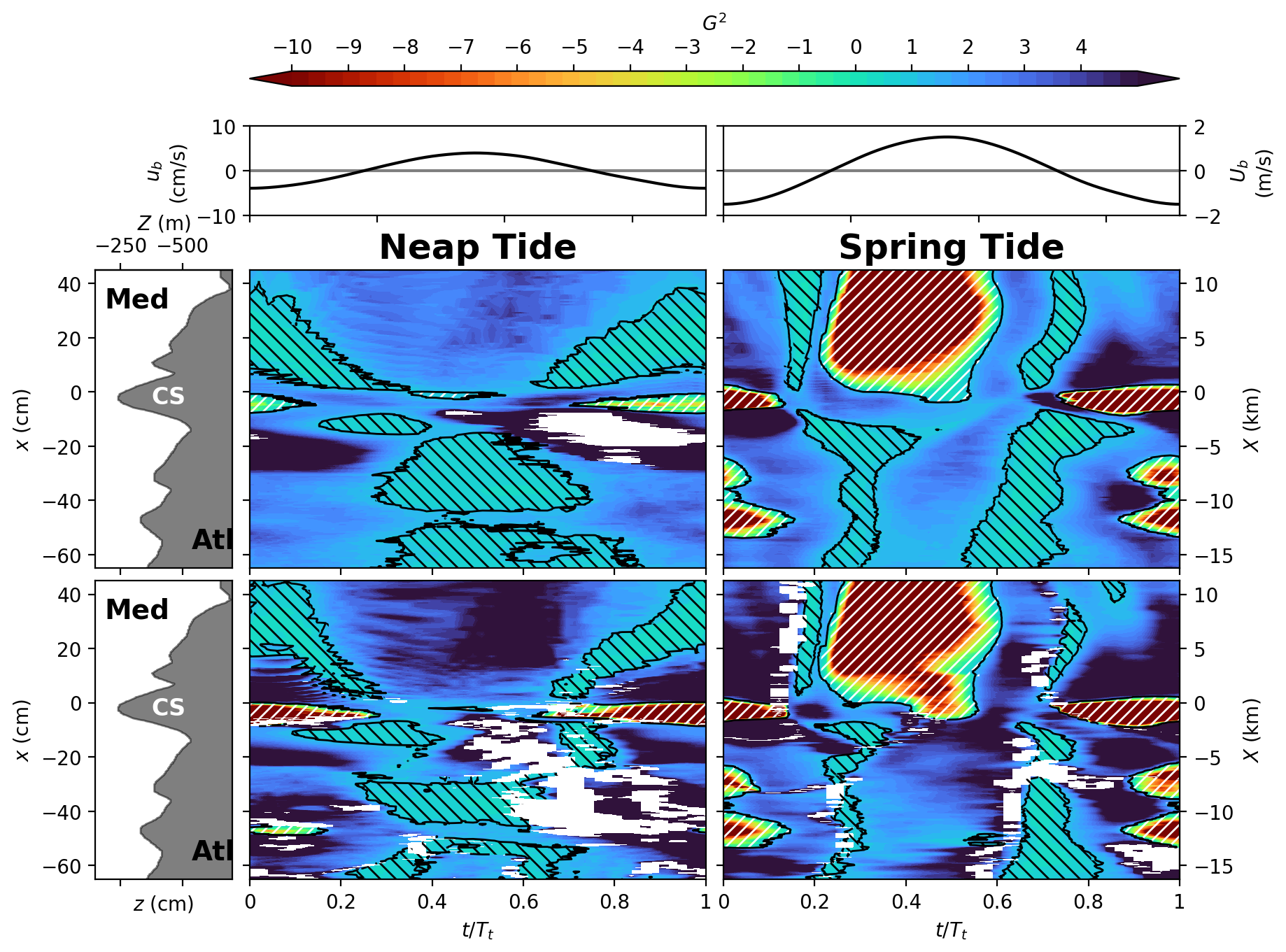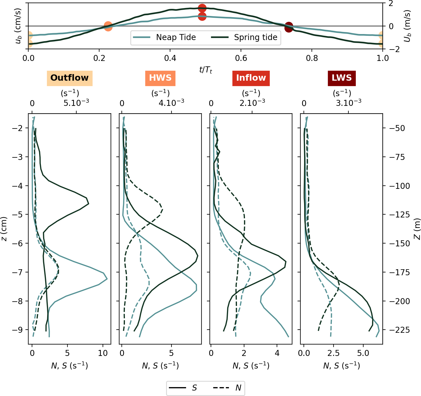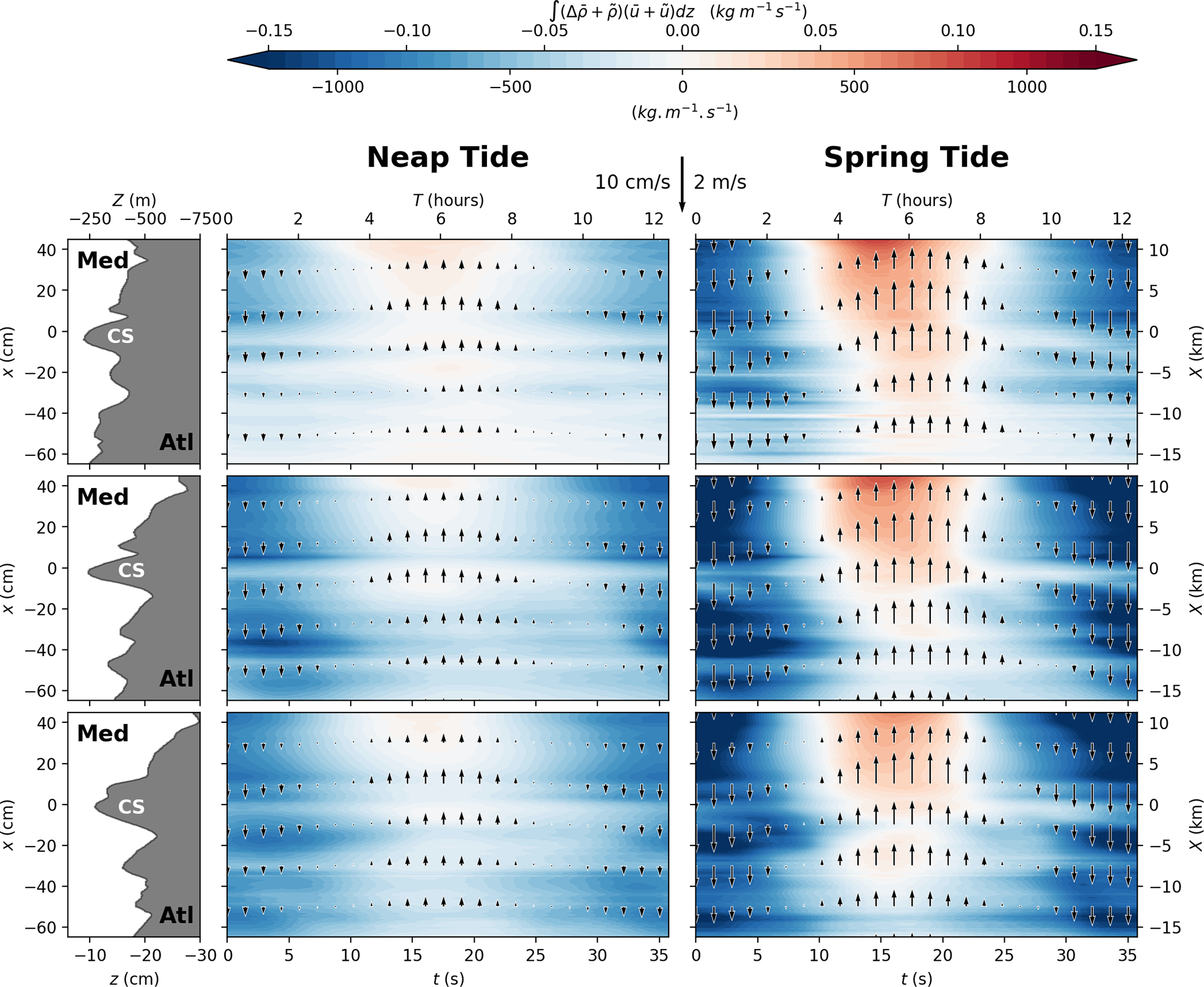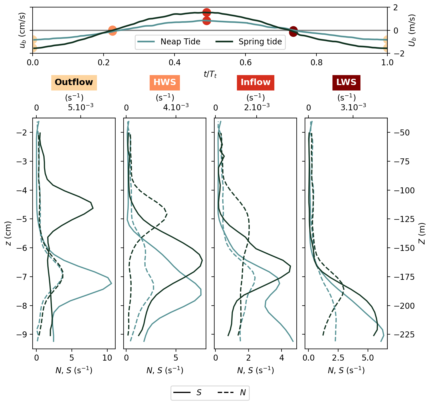 In the following Sect. 4.1, we first present time averaged velocity and density fields (, ), whereas the inflow and outflow dynamics during both spring tide and neap tide (, ) are analyzed in Sect. 4.2.