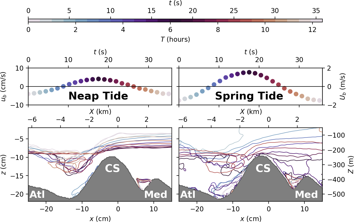 The tide in the Strait of Gibraltar creates a barotropic current of the order of magnitude of 1 m s−1 at CS during neap tide and up to twice during spring tide (Hilt et al., 2020; Roustan et al., 2023). The barotropic flow for both neap tide and spring tide conditions in the laboratory model are reported in Fig. 2b. The ADV (Acoustic Doppler Velocimetry, see Sect. 3.3) placed at CS at from the free surface, measured an amplitude of 10 cm s−1 for the purely barotropic velocity1 in the spring tide configuration and 5 cm s−1 in the neap tide configuration, which is in agreement with in situ measurements (Roustan et al., 2023) considering a velocity scale factor of 20 (cf. Table 1).