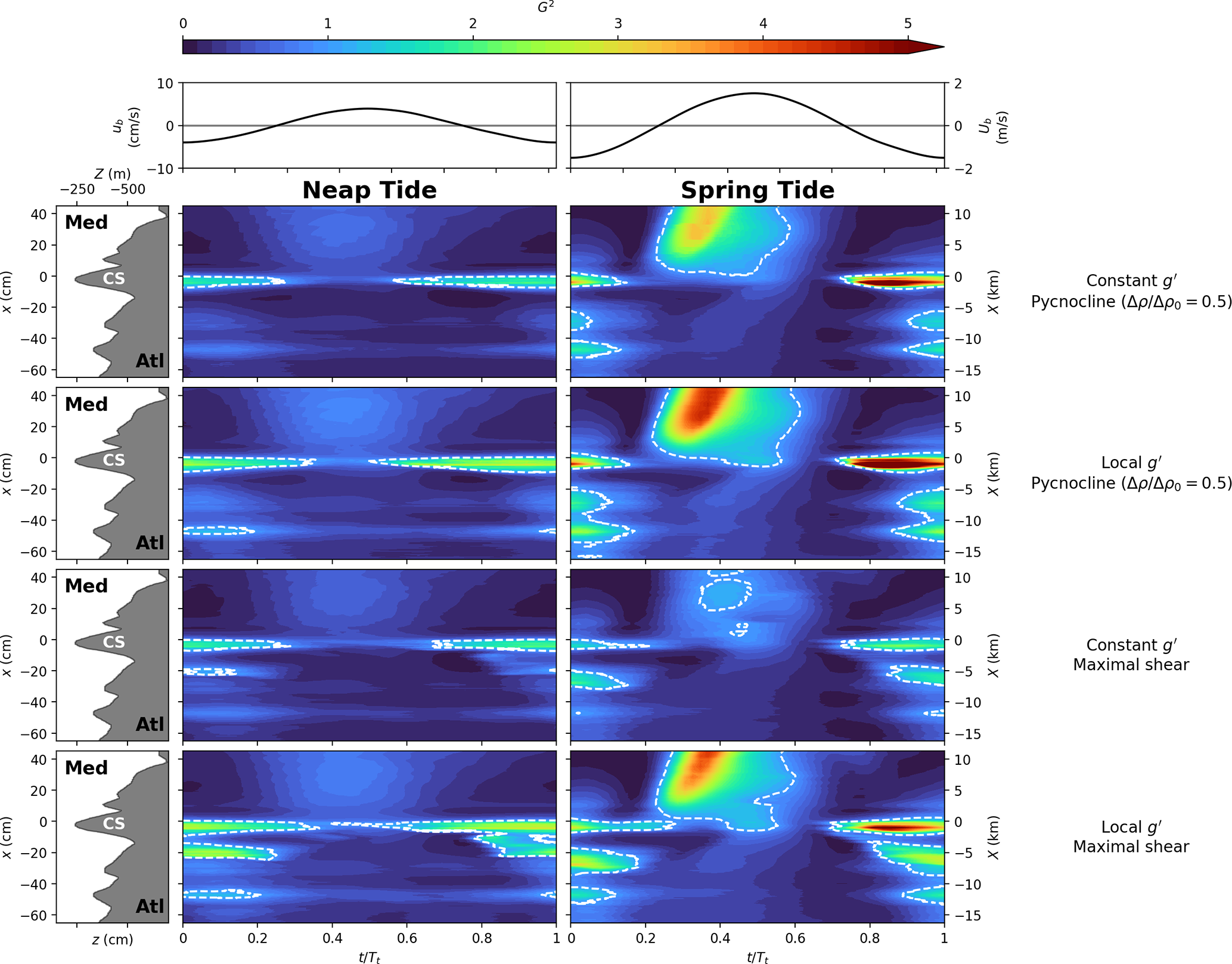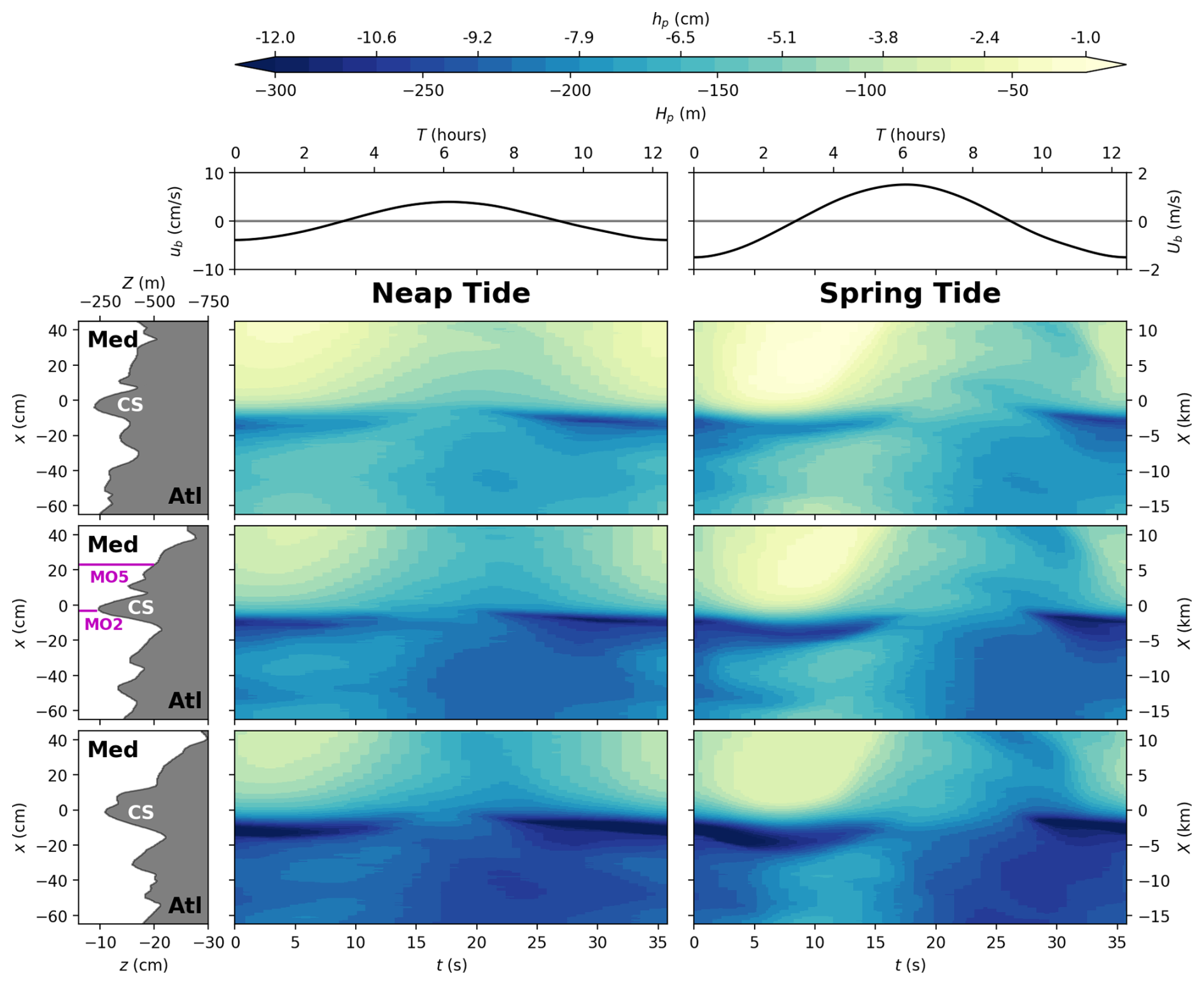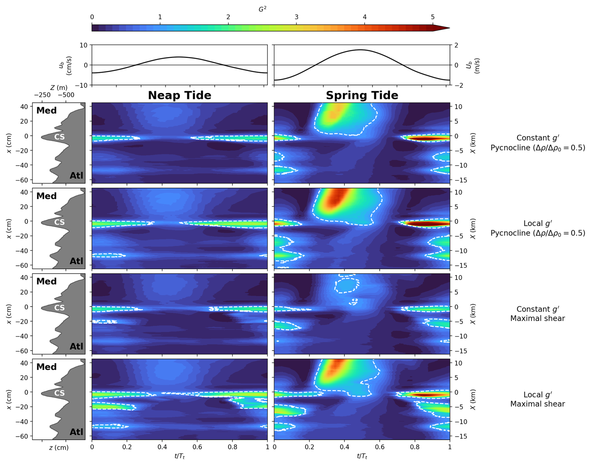 The abrupt downward plunge of the pycnocline and the increased thickness of the mixed layer west of CS suggests the presence of an internal hydraulic jump for all tidal conditions. This is supported by the strong vertical velocity change in the third row panels of Fig. 4 observed at the same location. When the tidal amplitude increases in spring tide conditions, the positive/negative maxima of the vertical velocity descend. This can be understood considering that the differences between inflow and outflow are more pronounced during spring tide as compared to neap tide: during outflow, the Mediterranean waters are advected further downstream and the internal hydraulic jump oscillates west of CS with the tidal phase and disappears even during inflow, such that the averaged velocity fields are homogenized over the entire considered field on the west of CS. During neap tide instead, the internal hydraulic jump is stably localized close to the western flank of the sill and persists longer during the tidal cycle, even during part of the inflow. This will be further discussed in the following Sect. 4.2 below.