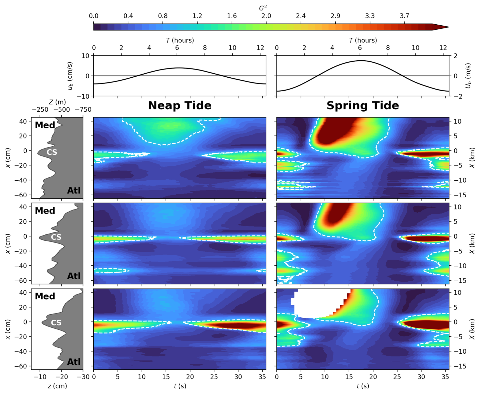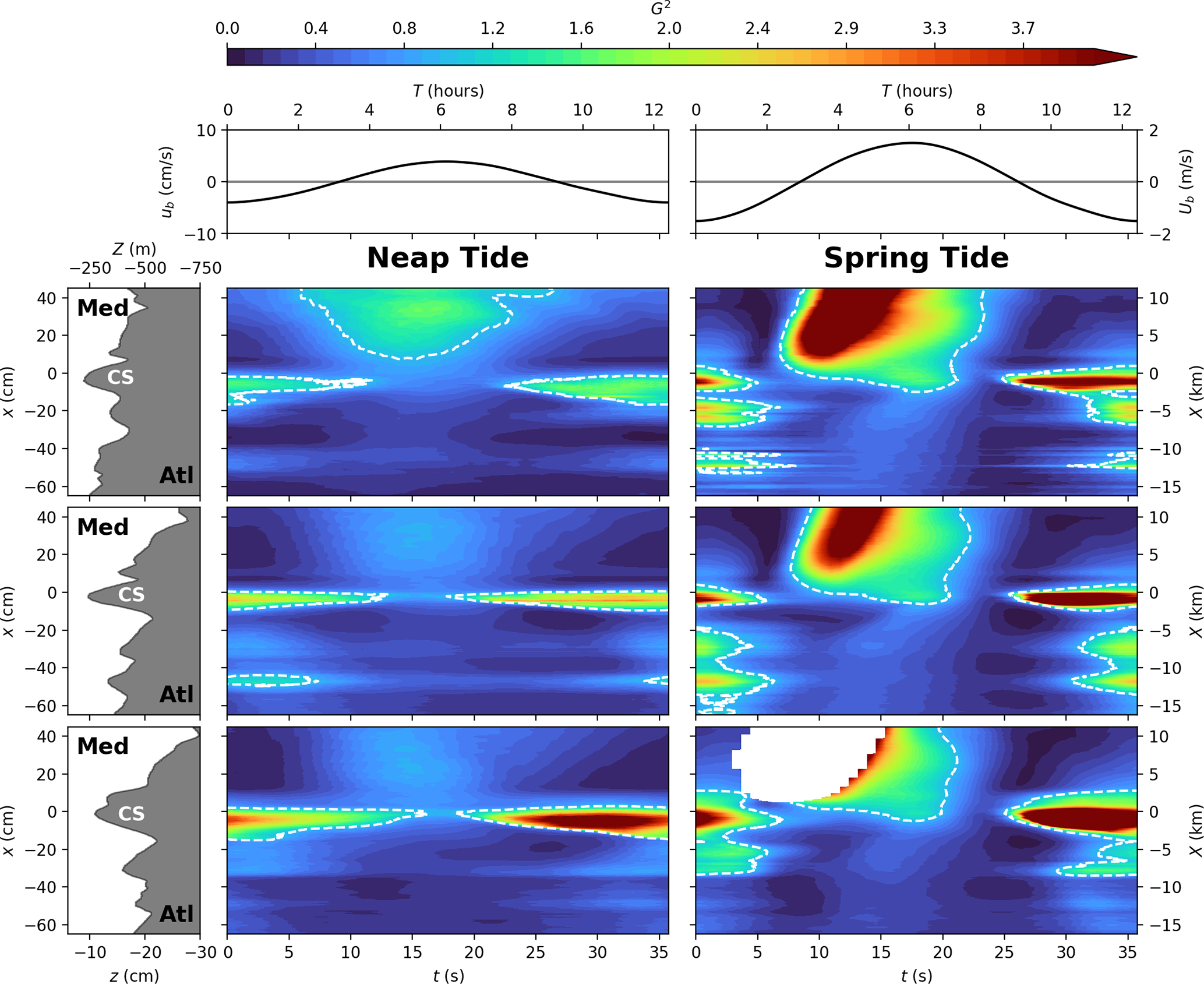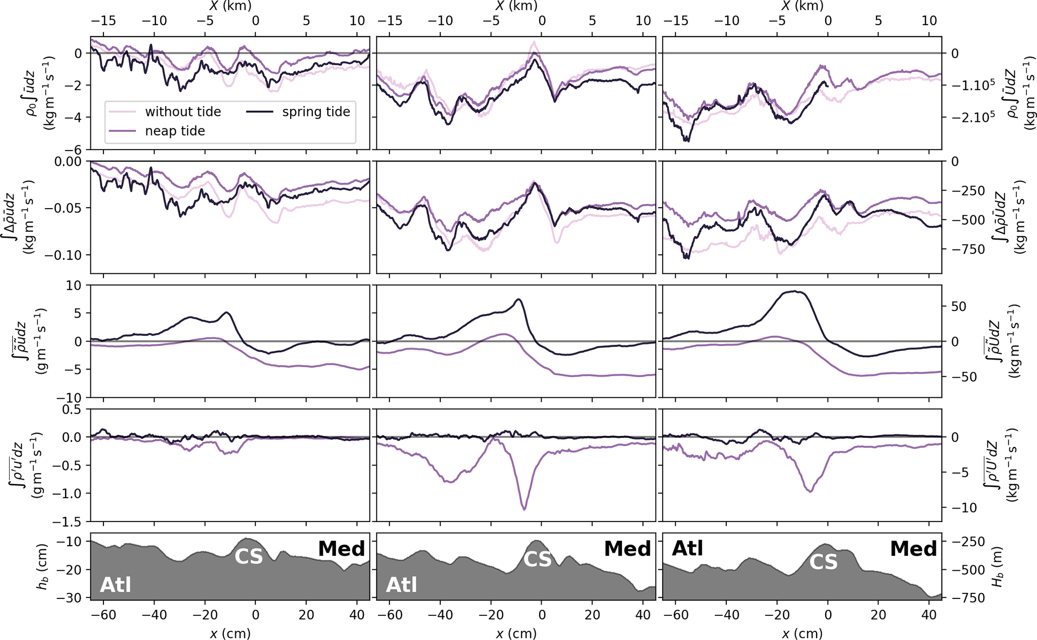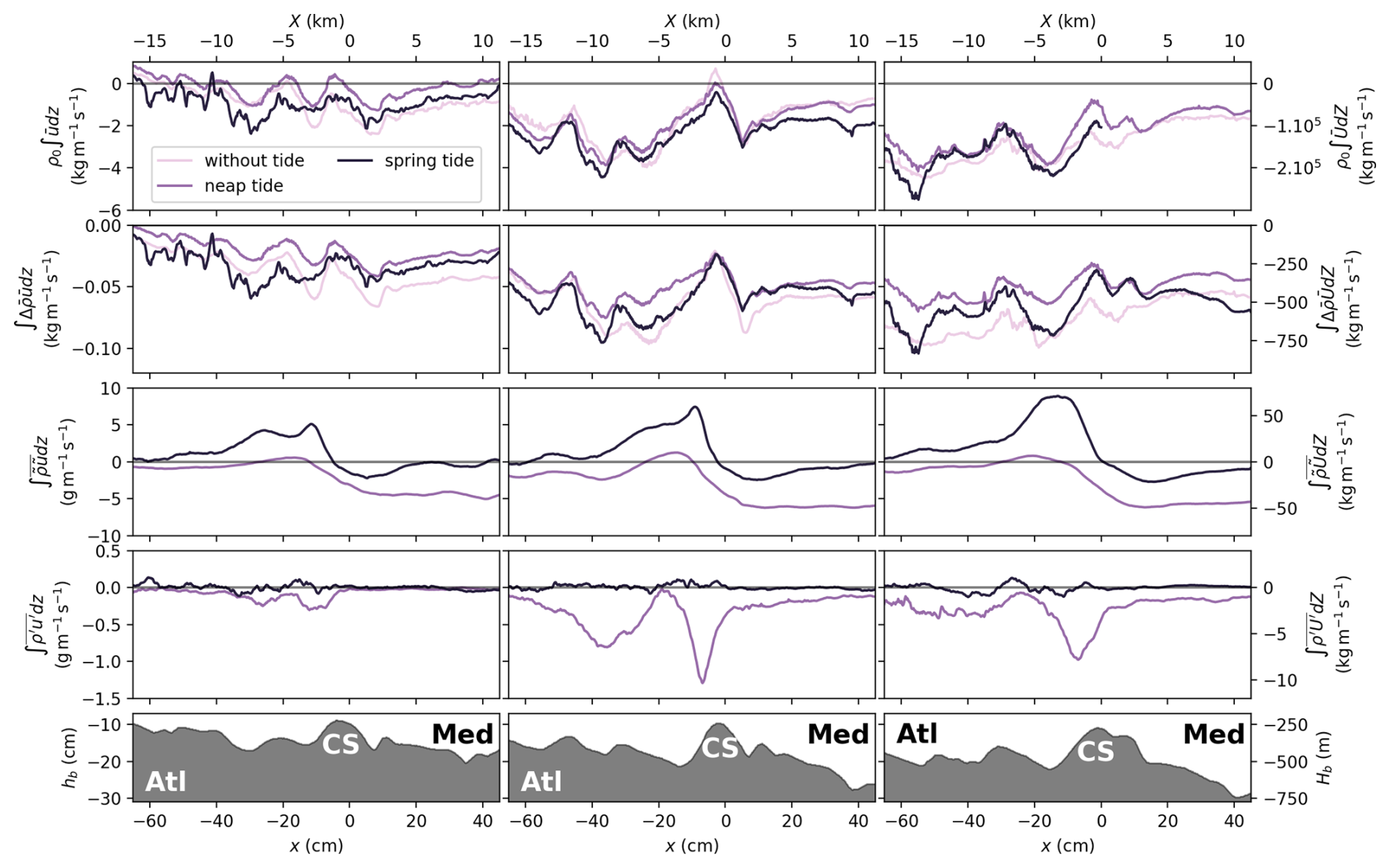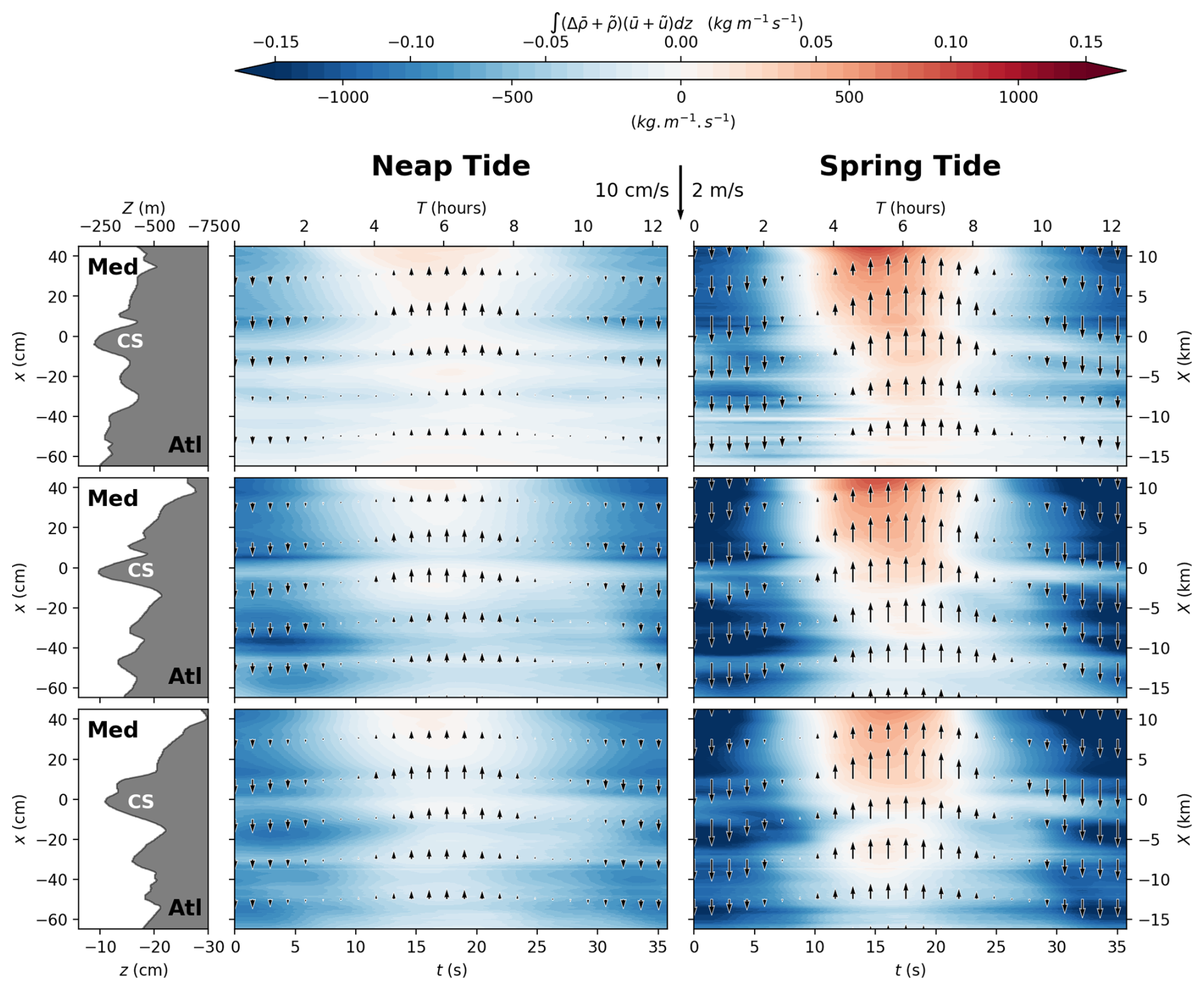 Also, it appears that Mediterranean waters are more diluted (of about 0.3ρ*) west of CS in neap tide compared to spring tide conditions, an aspect which will be further discussed in Sect. 4.2. These observations are also applicable in the case of the northern (Fig. B1) and southern (Fig. B2) transects given in the Appendix.