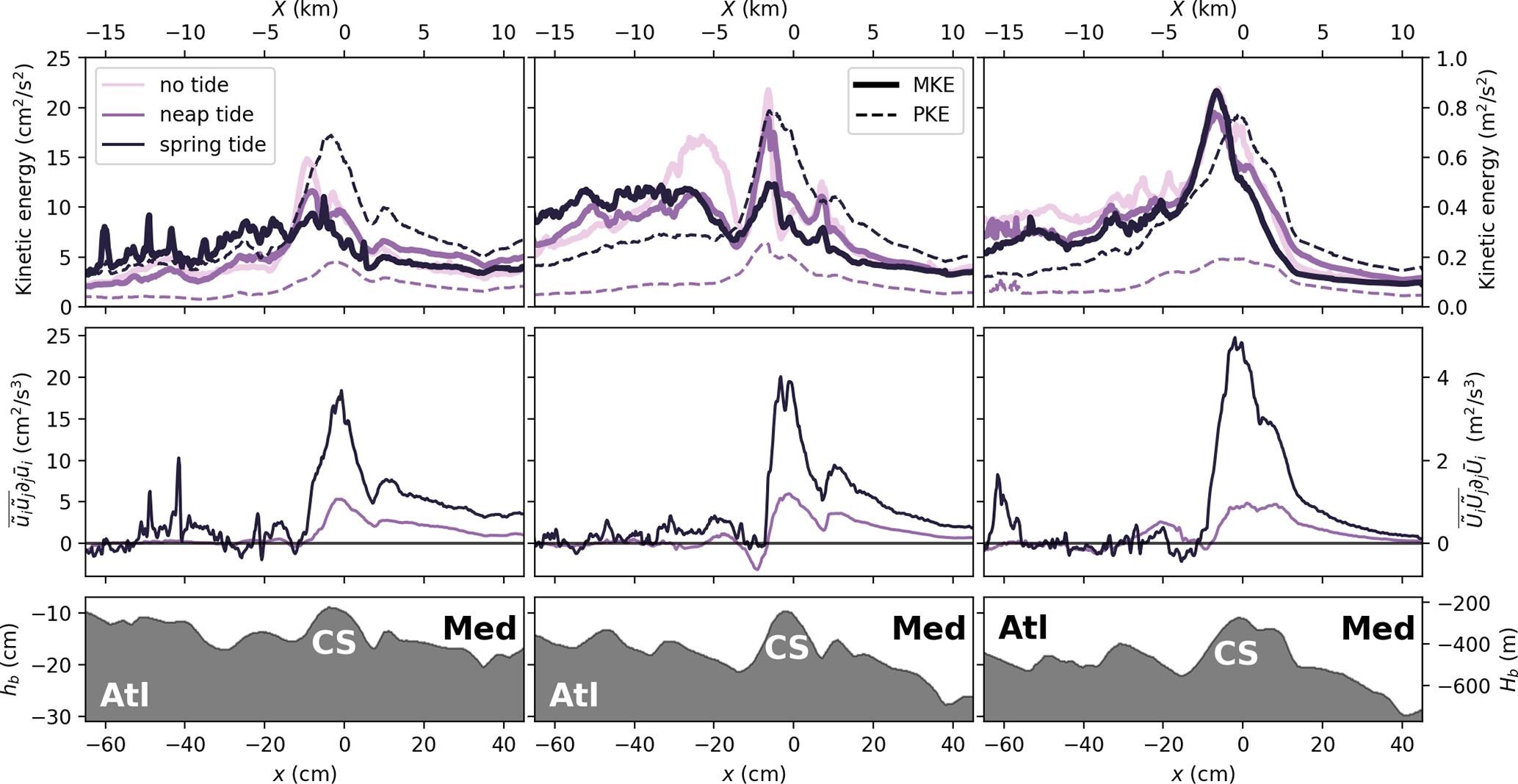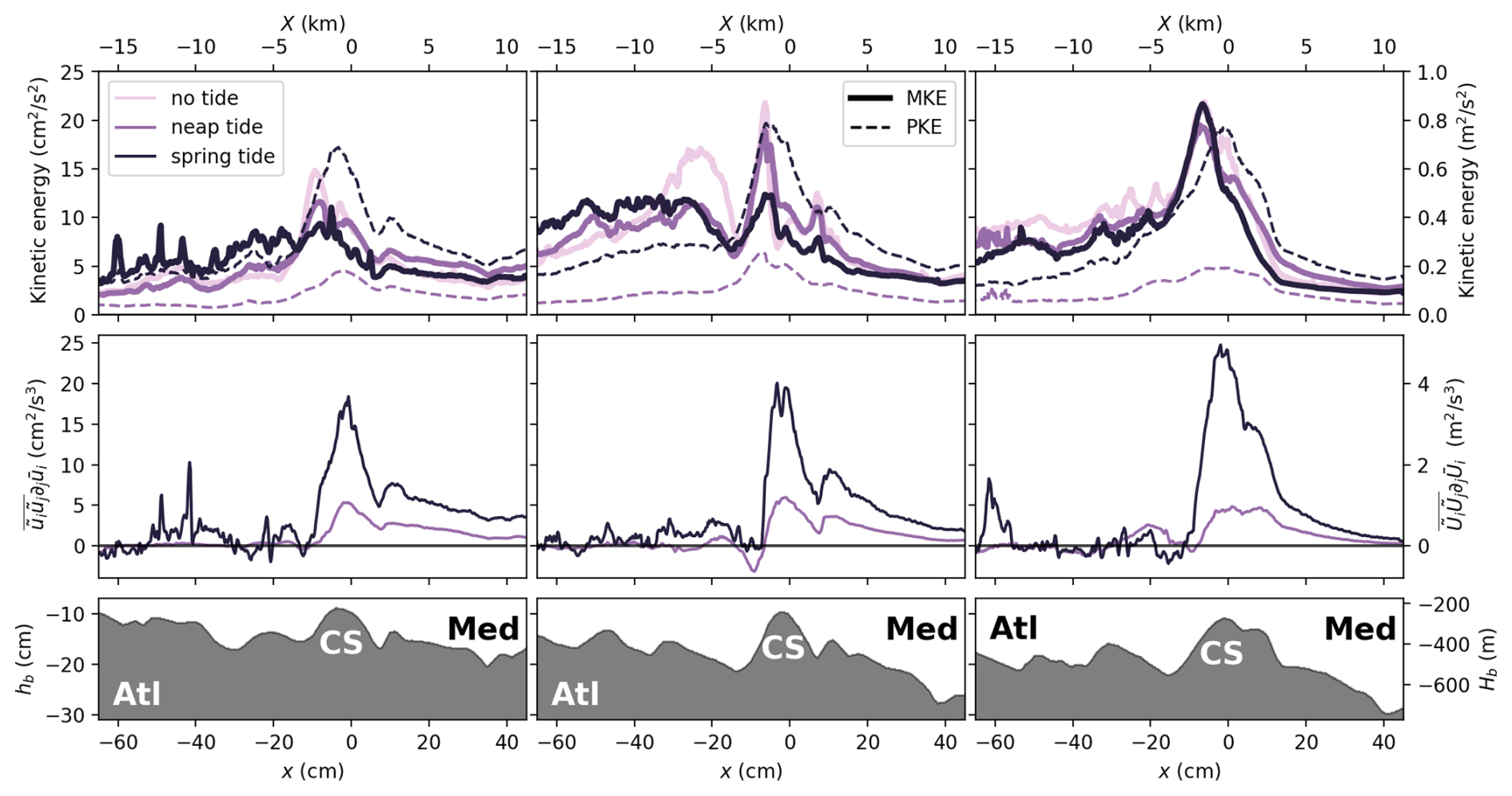 The bottom panels of Fig. 4 (and Figs. B1 and B2 for the northern and southern transects given in the Appendix) report the turbulent kinetic energy (), which interestingly appears to be highest close to the bottom boundaries. The intensity of the TKE also increases with increasing tidal forcing and appears to be linked to the bottom boundary-layer detachment on the west side of CS and the formation of a recirculation area. In comparison, the TKE between the two layers at the interface of Mediterranean and Atlantic waters is roughly half as strong. Moreover, since the detachment appears only when the tidal forcing is present, as shown from the second row panels for the velocity u. In the purely baroclinic case, high TKE values at the interface are observed at the onset of the descent. Further downstream, the interface becomes indistinguishable due to the development of the hydraulic jump, where TKE values increase. It should be noted that, due to the larger aspect ratio used in the experiments, the TKE is not strictly in similarity to that in the real ocean. Since the characteristic velocity scales are U in the horizontal and in the vertical, the relative contribution of vertical velocity fluctuations (w′) to the TKE is enhanced in the experimental configuration, potentially leading to elevated turbulence levels. Nevertheless, because the vertical contribution remains smaller in magnitude than the horizontal one, the overall order of magnitude of the TKE is preserved.