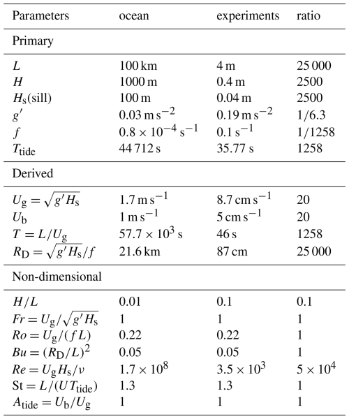 The baroclinic contribution to velocity is set by the initial velocity Ug of the gravity current. It is given by the hydraulic control condition at Camarinal Sill (CS), where g′ corresponds to the relative density difference between the Mediterranean and surface Atlantic waters (Roustan et al., 2023) and Hs≃100 m is the half water depth at CS approximately. This estimate gives Ug≃1.7 m s−1. A more precise estimate is obtained by introducing the control condition for the composite Froude number , with being the internal Froude numbers of each layer. The velocity is then reduced by a factor , in closer agreement with observation values of 1 m s−1. In the experiments, the corresponding height is reduced by a factor 2500, so the baroclinic velocity is reduced by a factor if we keep the same relative density difference. To increase the velocity, hence the Reynolds number, we choose a higher density difference , which enhances Ug by . This value of the relative density difference is still small, well within the condition for the Boussinesq approximation, so it comes into play only through the reduced gravity g′. The baroclinic velocity is then reduced by a factor 20 with respect to the ocean. Since the horizontal scale is reduced by a factor 25 000, the time scale is reduced by a factor 1250.