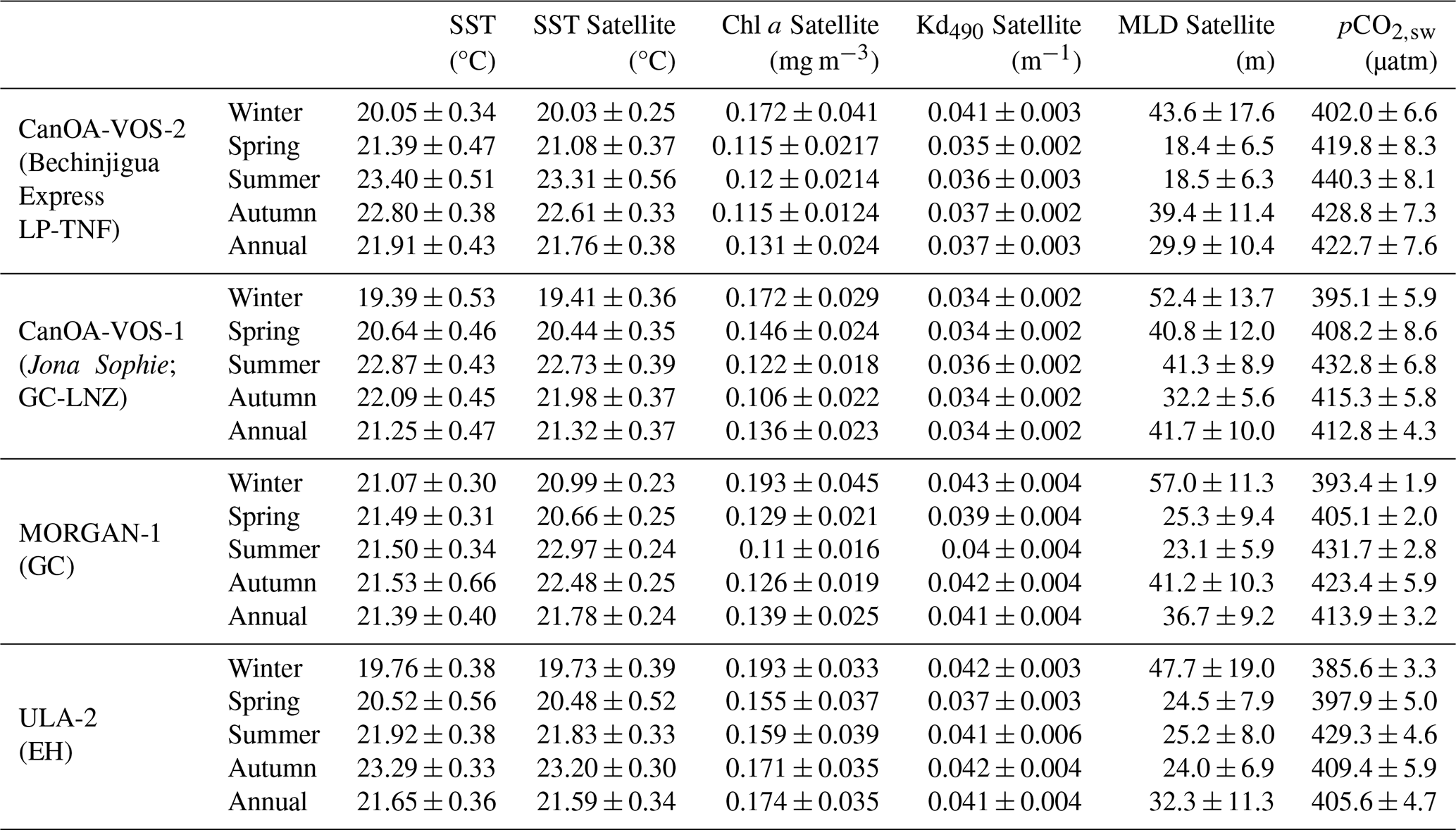 Table 1Seasonal mean and standard deviations of observational data (pCO2,sw and SST) and satellite-derived data (SST, Chl a, Kd490 and MLD) used in this study. The locations listed in the first column correspond to the two ship routes (CanOA-VOS-1 Jona Sophie and CanOA-VOS-2 Benchijigua Express) and the two moored buoys (MORGAN-1 and ULA-2).