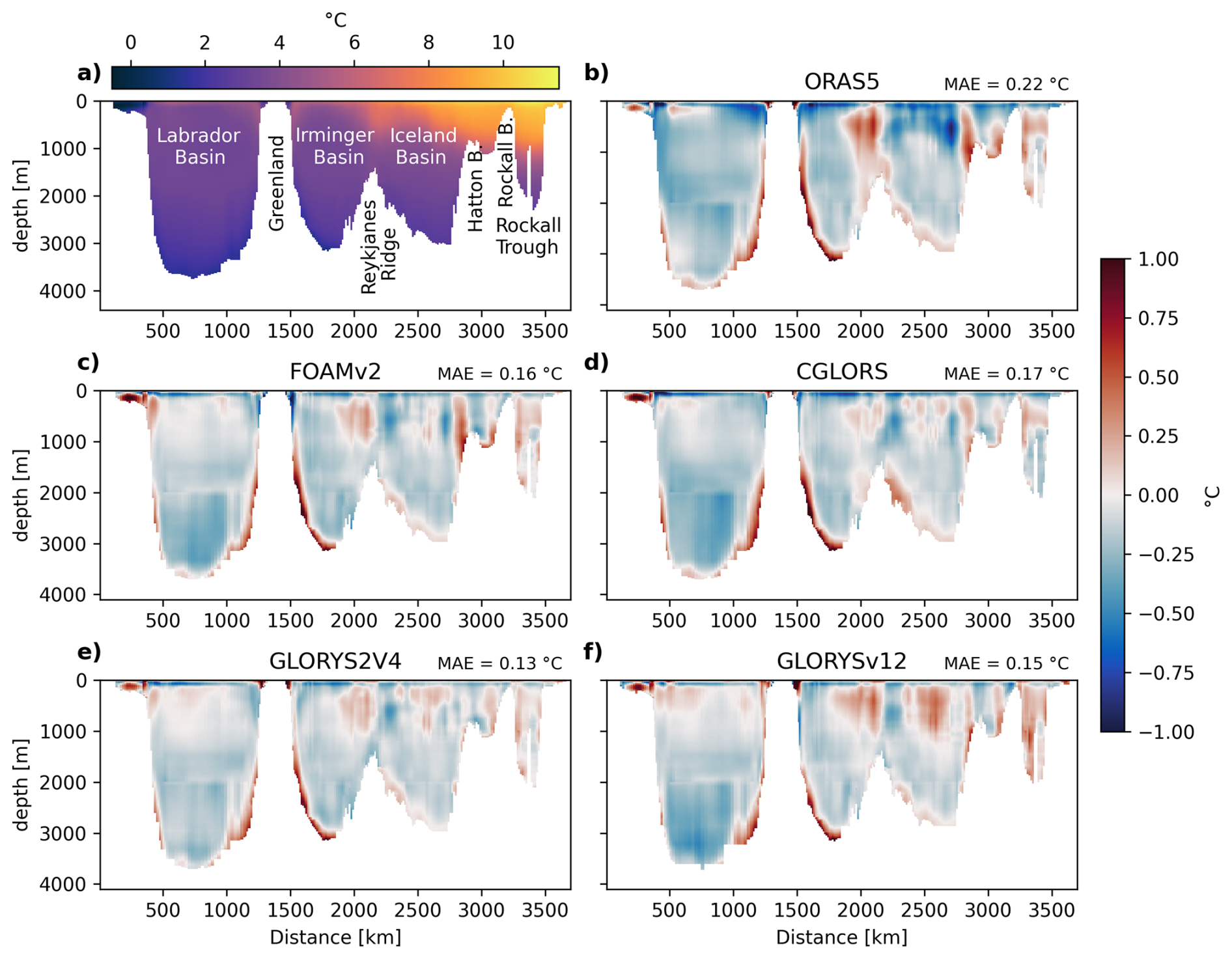 Figure 2(a) Cross sections of August 2014 to June 2020 average temperatures along the OSNAP section; (b–f) biases of temperatures compared to OSNAP for the respective reanalyses. Mean Absolute Error (MAE) is indicated in the top-right corner of each bias panel.
