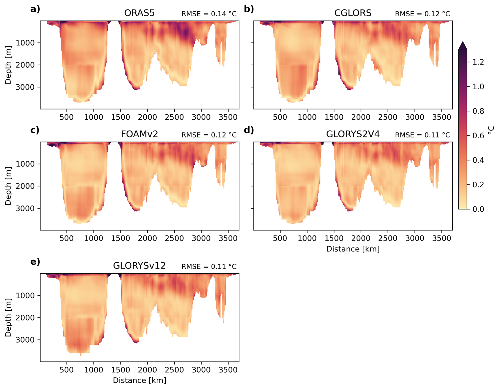 Figure 3Cross-sections of temporal temperature RMSE (annual cycle removed) relative to OSNAP East for each reanalysis product over the period August 2014 to June 2020. Mean RMSE values are shown in the top-right corner of each panel.