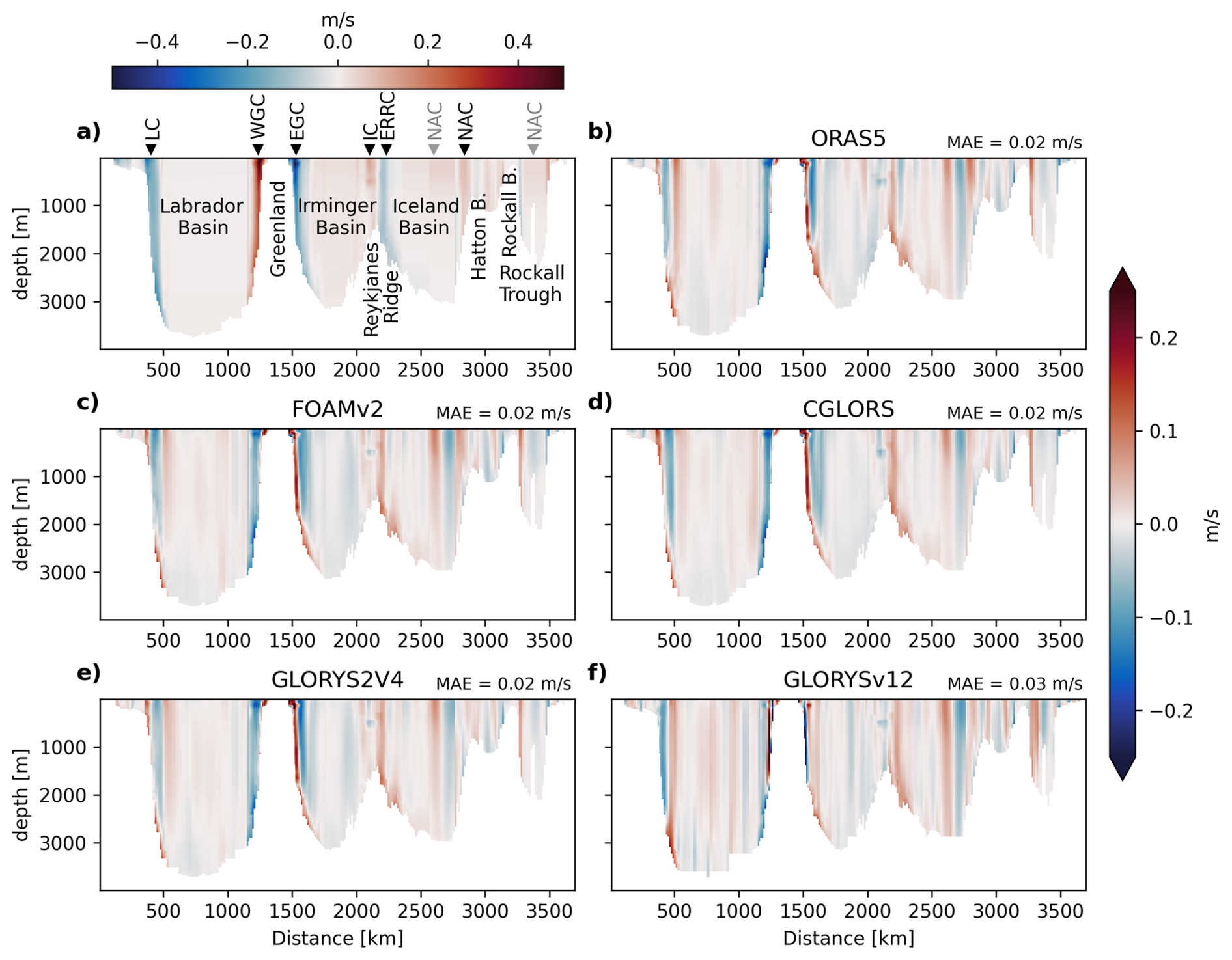 Figure 4(a) Cross-section of August 2014 to June 2020 average velocities along the OSNAP section; (b–f) bias of velocity compared to OSNAP for the respective reanalyses. Major currents are indicated: Labrador Current (LC), West Greenland Current (WGC), East Greenland Current (EGC), Irminger Current (IC), East Reykjanes Ridge Current (ERRC) various branches of the North Atlantic Current (NAC; labeled in grey where no moorings are present). Mean Absolute Error (MAE) is indicated in the top-right corner of each bias panel.