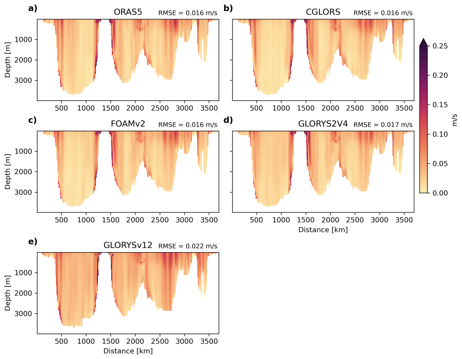 Figure 5 presents the velocity temporal RMSE values relative to OSNAP observations. All reanalyses display similar spatial RMSE patterns, with GLORYS12V1 exhibiting greater variability due to its higher horizontal resolution. The largest variances are associated with major currents, particularly the North Atlantic Current in the Iceland Basin, where mooring observations are absent. In the basin interiors, the RMSE fields exhibit a streaky appearance, which likely reflects current misplacements but may also partly result from the sparse spatial coverage of the OSNAP moorings in the interior.
