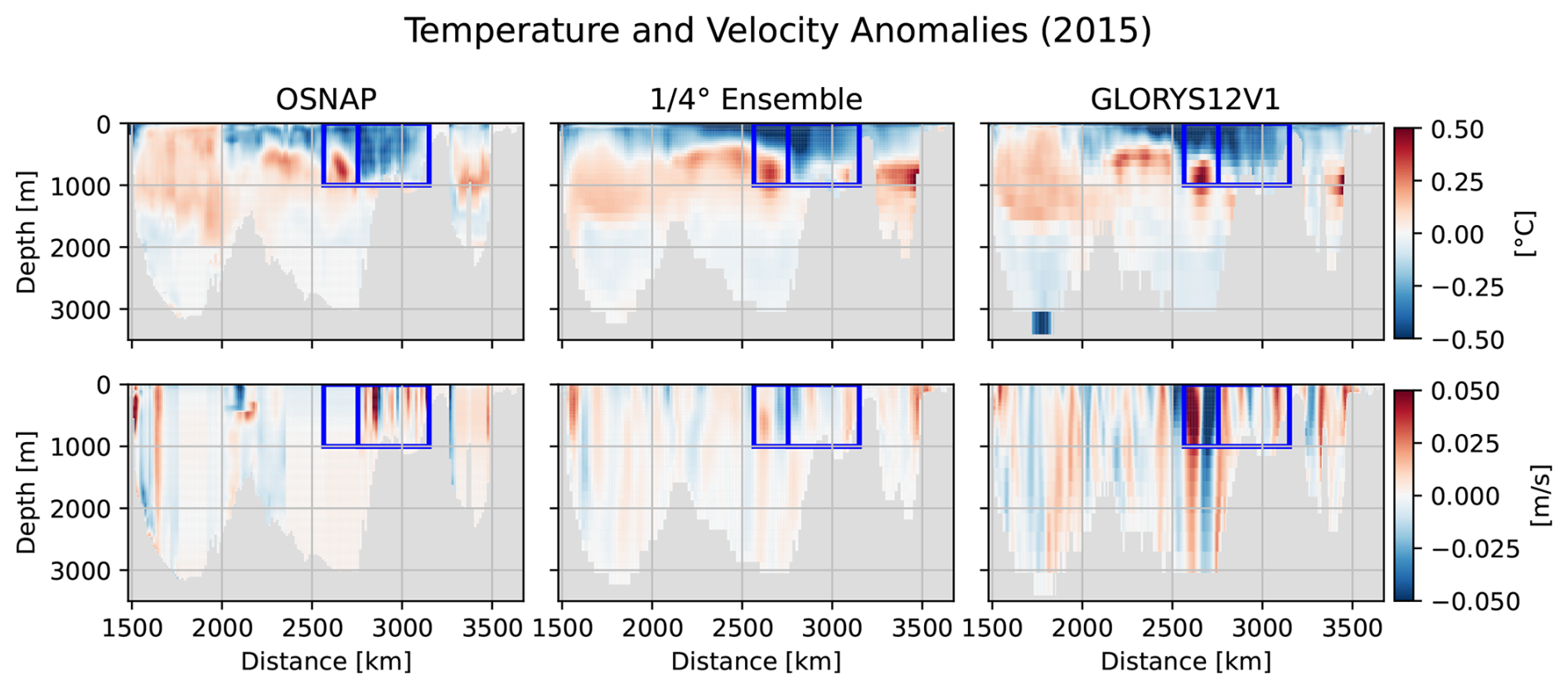 Figure 9Temperature (top) and velocity (bottom) anomalies for the 2015 period for OSNAP (left) the mean of all four quarter degree reanalyses (middle) and GLORYS12V1 (right). The eastern and western glider region are indicated by the blue box.