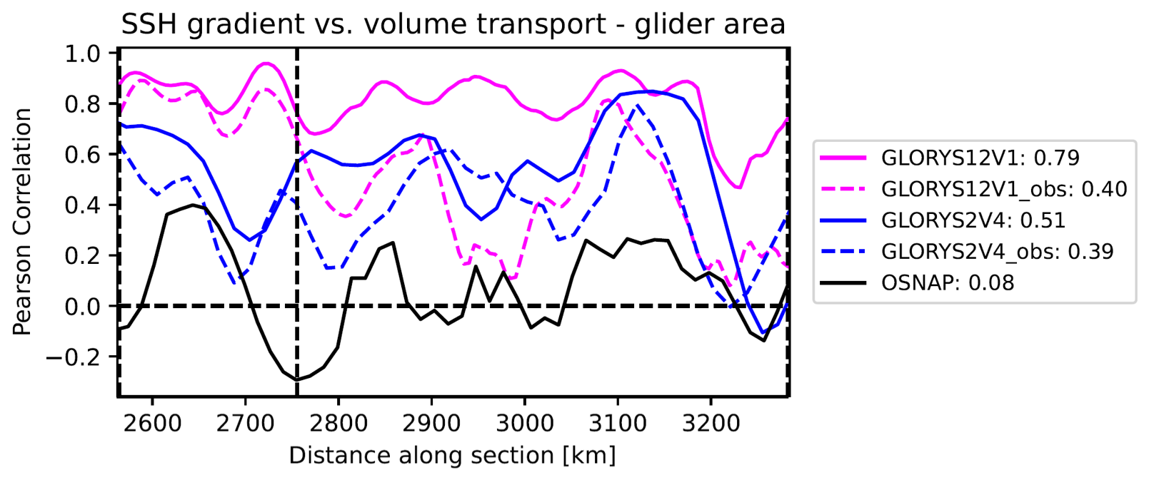 Correlations between SLA gradients and volume transport across the glider region are shown in Fig. 11. Solid lines represent correlations between each reanalysis and its own SLA gradient field, while dashed lines represent correlations to the observational SLA gradient. As expected given OSNAP’s time-mean reference velocity, OSNAP shows weak pointwise correlations with observed SLA gradients (mean ≈ 0.08 along the section). In contrast, GLORYS12V1 and GLORYS2V4 exhibit higher correlations with observed SLA gradients (0.40 and 0.39, respectively) and even larger values when compared to their own SLA fields (0.79 and 0.51). Both products assimilate the same multi-mission satellite altimetry-derived SLA observations but differ in horizontal resolution and assimilation methodology (see Table 1). Notably, the higher-resolution GLORYS12V1 shows the strongest correlations overall, consistent with its improved spatial representation of circulation features. Correlations are weaker for the ORAS5 reanalysis (not shown), with a correlation of just 0.25 against observed SLA gradients, likely a result of it not assimilating sea level anomalies north of 50° N. To reduce small-scale noise and facilitate visualization, the along-section correlation curves shown in Fig. 11 are smoothed to 1° resolution. This smoothing is applied only for plotting purposes and does not affect the calculation of the correlations themselves, which are performed on the native-resolution fields along the OSNAP section. This allows us to focus on mesoscale dynamics while suppressing small-scale variability and potential sampling mismatches. Despite this visual smoothing, pointwise correlations across the section remain relatively low for the OSNAP dataset. However, when SLA gradients and volume transport are averaged over the two full glider regions before computing the correlation, substantially higher values are found for OSNAP (0.55 for the western, 0.47 for the eastern glider region) and GLORYS12V1 (0.72 for the western, 0.89 for the eastern), while the correlation for GLORYS2V4 decreases slightly (0.32 for the western, 0.37 for the eastern). These reanalysis-based values refer to correlations with their respective SLA gradient fields. Overall, these results suggest that, while local correlations are sensitive to methodology, sampling, and the limited ability of observations and reanalyses to resolve small-scale processes, the large-scale geostrophic relationship emerges clearly after spatial averaging over the glider regions in both the observations and the high-resolution reanalyses.