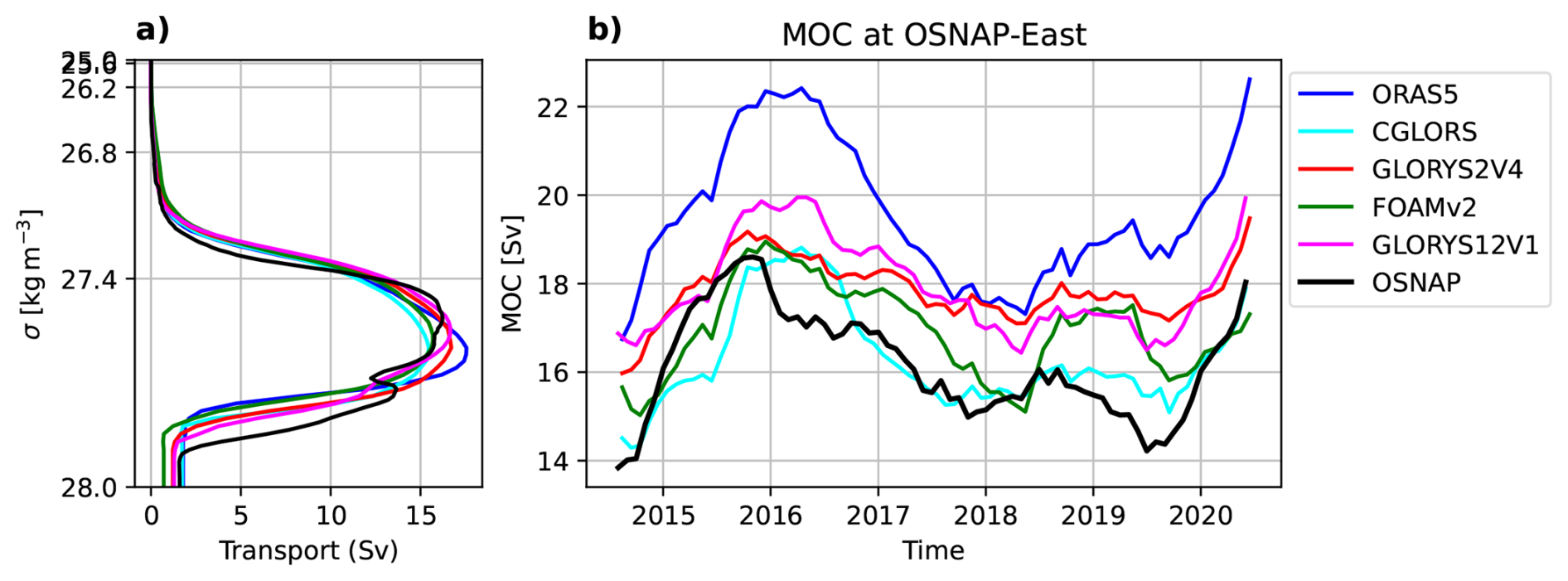 To complement the heat transport analysis, we also assess the Meridional Overturning Circulation (AMOC) in density space at OSNAP East (Fig. 12). The reanalyses reproduce the mean overturning streamfunction reasonably well, consistent with earlier findings by Baker et al. (2022), with a maximum around 27.5–27.6 kg m−3 and peak strengths of about 16 Sv, slightly higher in the reanalyses, particularly in ORAS5. In terms of variability, OSNAP observations show a clear peak in 2015, which coincides with the observed heat transport variability (see Fig. 6). Interestingly, the reanalyses also display a peak in overturning strength, though shifted slightly later, to early 2016. However, and as discussed in Sect. 3.2, this overturning peak does not coincide with a heat transport peak in the reanalyses. Looking at transports of the in- and outflow branches of the overturning, we find that in GLORYS12V1 both inflow and outflow heat transports are stronger than in OSNAP, but the outflow has a greater net effect than in OSNAP. This suppresses the overall heat transport peak despite intensified overturning. The mismatch may result from temperature biases, such as colder inflow or warmer outflow, and suggests that the overturning in the reanalyses may involve different water mass properties or pathways than observed.