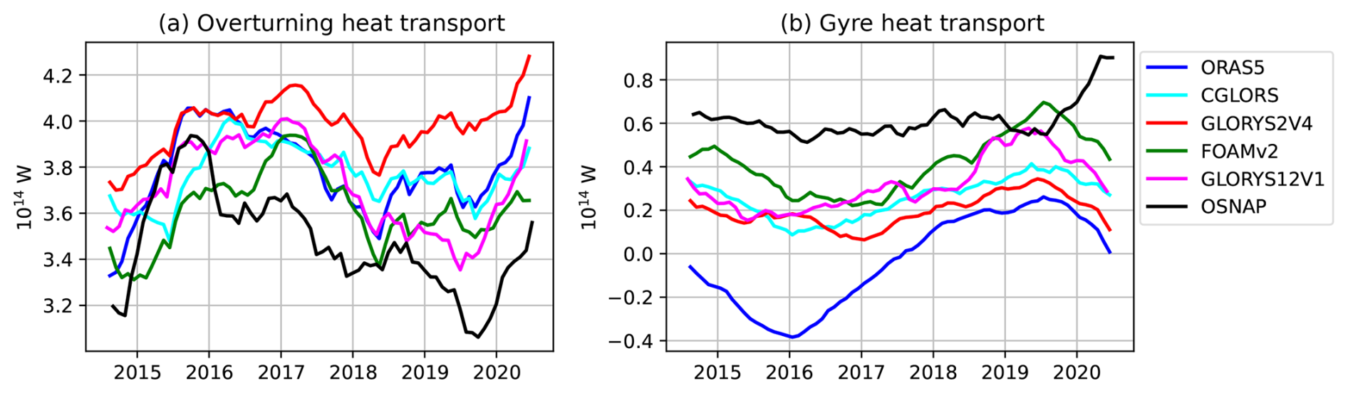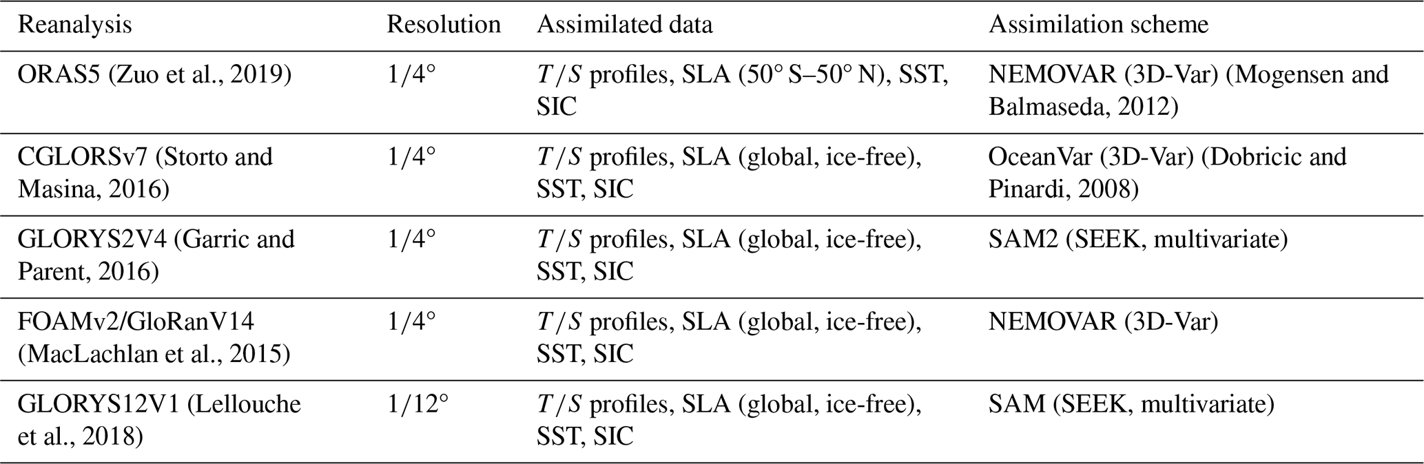 (Zuo et al., 2019)(Mogensen and Balmaseda, 2012)(Storto and Masina, 2016)(Dobricic and Pinardi, 2008)(Garric and Parent, 2016)(MacLachlan et al., 2015)(Lellouche et al., 2018)Table 1List of used ocean reanalyses. All reanalyses assimilate temperature and salinity profiles and sea level anomalies, which constrain the large-scale geostrophic circulation. None of the products assimilate direct velocity observations from current meters or ADCPs, including those from the OSNAP array.