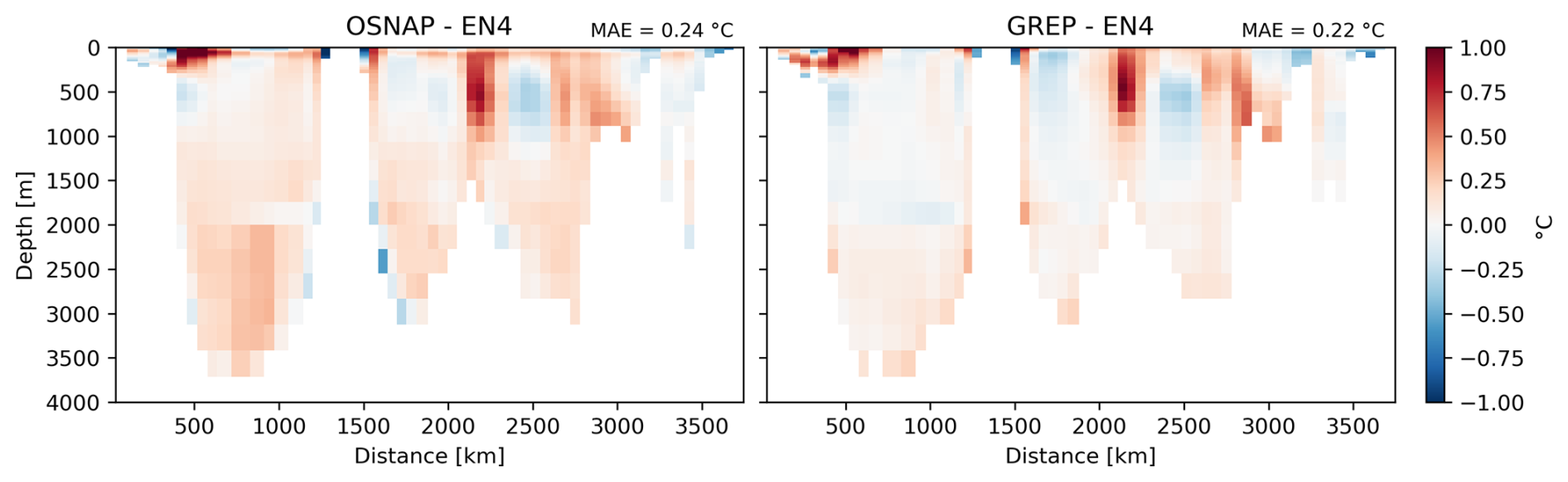 Figure A1Temperature differences between OSNAP observations and the EN4 objective analysis (left) as well as the GREP reanalyse mean and EN4 (right), averaged over the period August 2014 to June 2020. Positive values indicate regions where OSNAP/GREP is warmer than EN4.