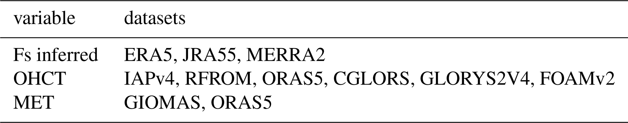 OHC is taken from the GREP reanalyses mentioned above, the Institute of Atmospheric Physics version 4 (IAPv4 Cheng et al., 2024a) and Random Forest Regression Ocean Maps (RFROM Lyman and Johnson, 2023). The melt ice tendencies MET is calculated from GIOMAS (Zhang and Rothrock, 2003) and ORAS5, which both provide ice thickness fields at 1 and ° resolution, respectively.