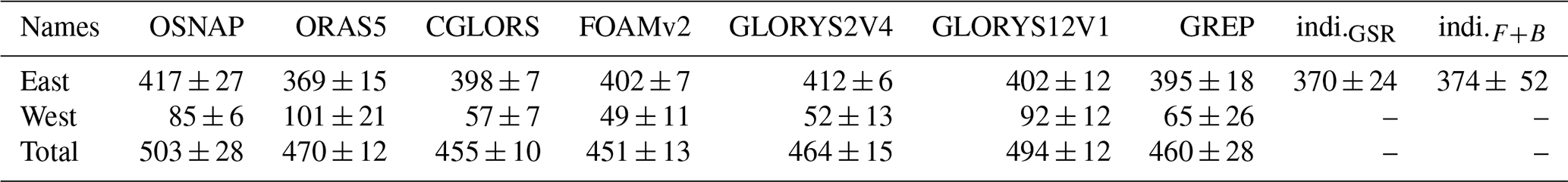 Table 3Mean heat transports (August 2014–June 2020) at OSNAP East, West, and for the full OSNAP section. Shown are values from the observational product, each reanalysis individually, the mean of the four 0.25∘ reanalyses (GREP), and the indirect estimates. Uncertainties for individual reanalyses are based on the standard deviation of annual mean values. For GREP and the indirect estimates, uncertainties reflect the spread across the contributing products (calculated as standard deviation).