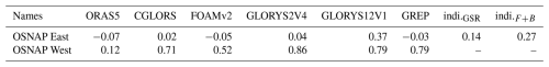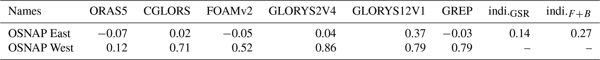 Table 4Correlation coefficients of heat transport at OSNAP East and OSNAP West for the period August 2014–June 2020, comparing observations with ocean reanalyses and (for OSNAP East) indirect estimates.