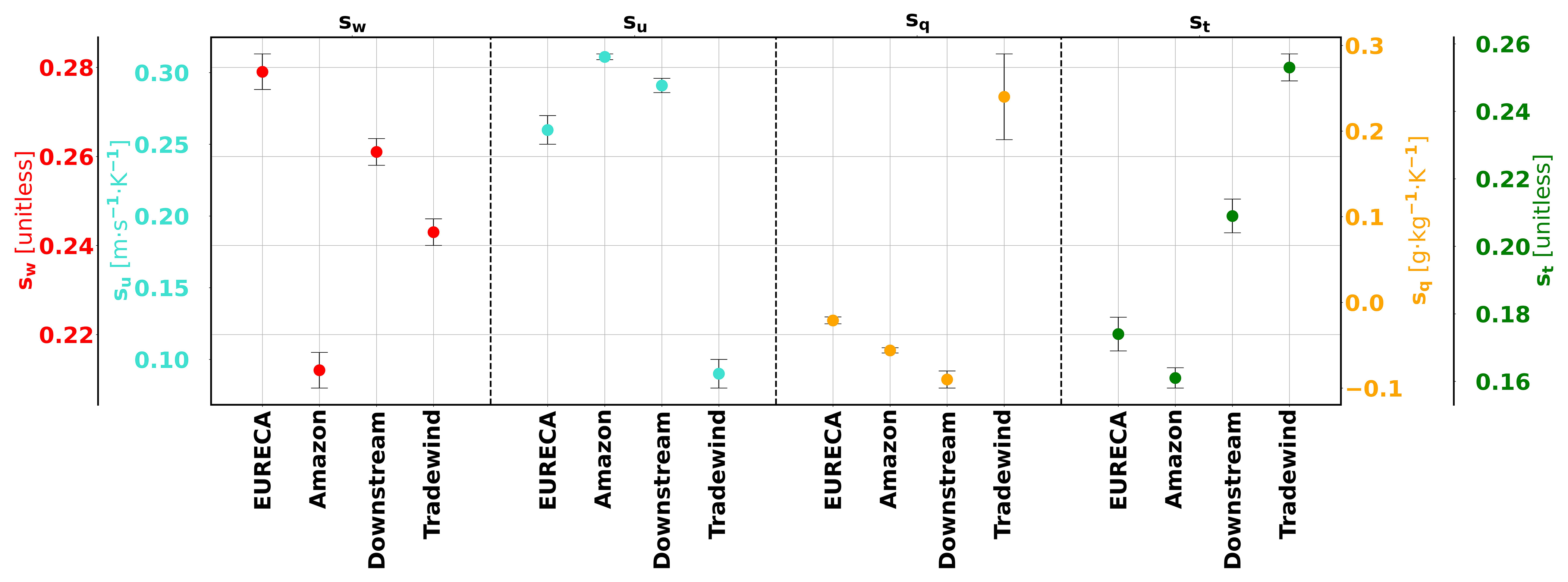 Figure 4Mesoscale coupling coefficients sw (red), su (cyan), sq (orange) and st (green). In each dot quartet, from left to right, the markers represent the corresponding coupling coefficient in the EURECA, Amazon, Downstream and Tradewind domains respectively. The error bars depict the standard error of the slope. All the coefficients displayed here are statistically significant at the 95 % level after a two-sided t test.