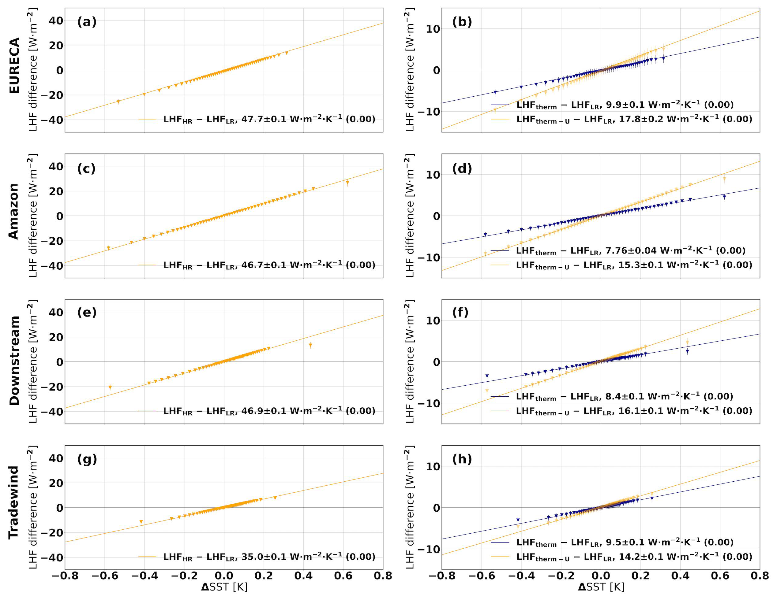 Figure 5LHF sensitivity to ΔSST (see Eq. 3) across different regions. Each row corresponds to a specific domain: the EURECA region (first row), the Amazon sub-region (second row), the Downstream sub-region (third row), and the Tradewind sub-region (fourth row). Panels (a), (c), (e), and (g) display the difference between LHFHR and LHFLR as a function of ΔSST. Panels (b), (d), (f), and (h) show the differences between LHFtherm and LHFLR, and between LHFtherm−U and LHFLR, as a function of ΔSST (blue and orange, respectively). The methodology used to compute these LHF datasets is detailed in the main text. The SST anomaly values are binned into 2 % percentile intervals. Vertical error bars indicate the standard deviation from the mean in each interval, while straight lines represent the least-squares regression fits. The regression slope ± standard error (p value) is reported at the bottom of each panel.