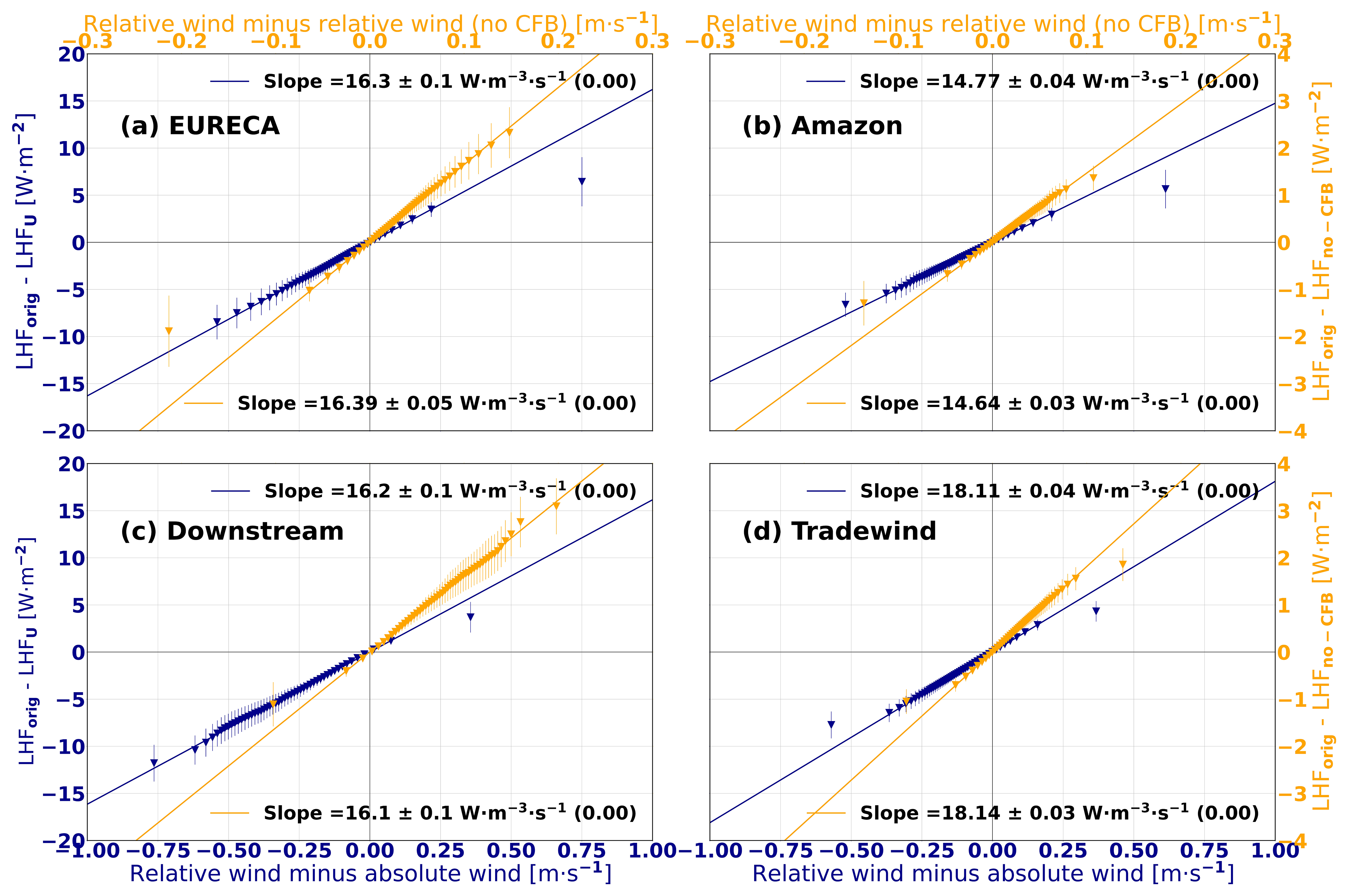 Figure 6LHF sensitivity to surface currents for (a) EURECA, (b) Amazon, (c) Downstream, and (d) Tradewind. In all panels, blue markers represent the difference between LHFU and LHForig as a function of the difference between the norm of the first vertical level wind velocity and the relative wind velocity field. Orange markers indicate the difference between LHForig and LHFno-CFB as a function of the difference between the norms of relative winds, with and without the CFB effect. The methodology used to derive these LHF datasets is detailed in the main text. The x axis variable is divided into intervals containing an equal number of values, using a 2 % percentile separation. Vertical error bars indicate the standard deviation relative to the mean for each interval, while straight lines denote the least-squares regression fits. The regression slope ± standard error (p value) is displayed in each panel's legend.