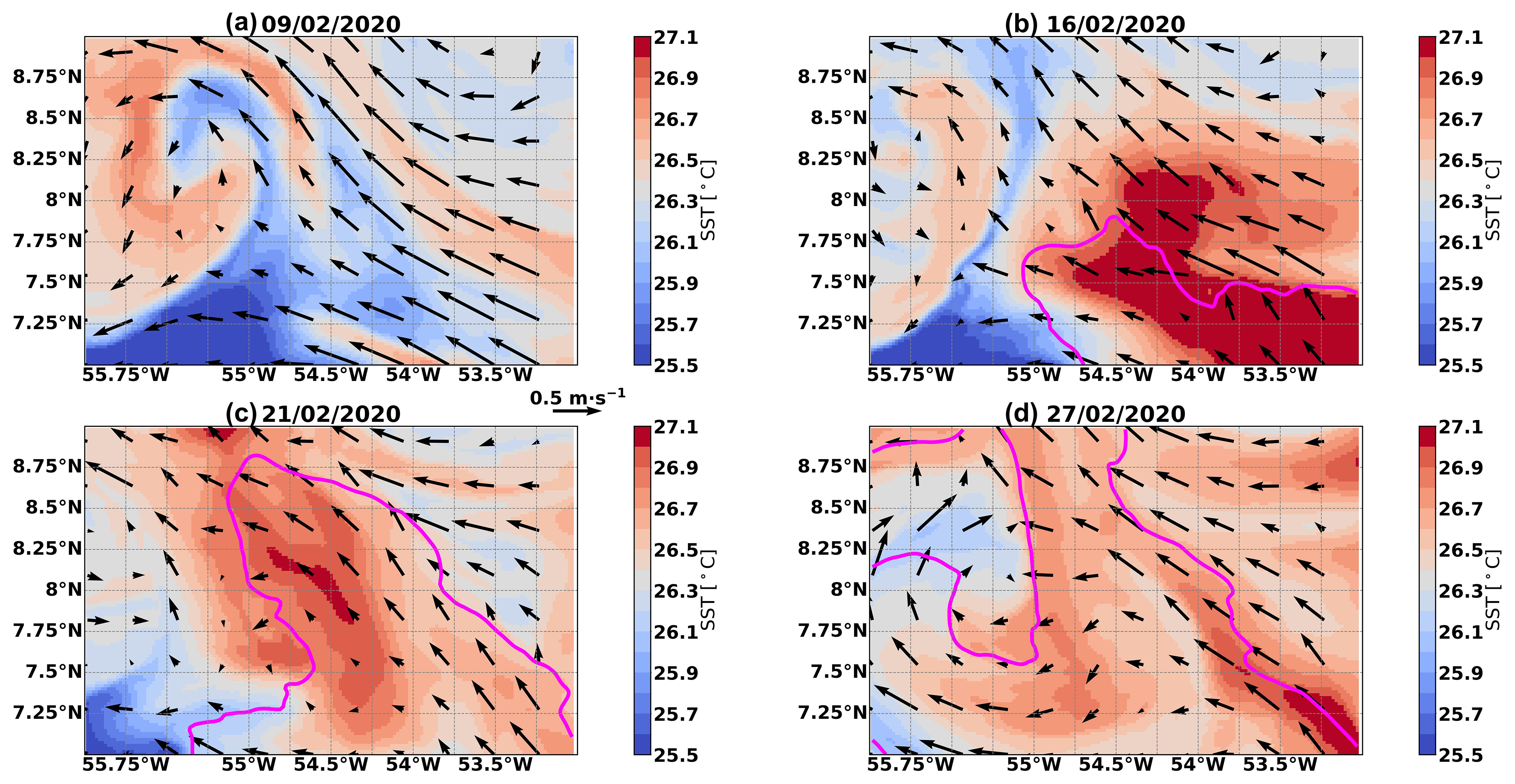 Figure 8Daily snapshots of SST (shading) overlaid with surface currents (arrows) and the 35 psu isoline which we use to delimit the Amazon plume (magenta) for the (a) 9, (b) 16, (c) 21, and (d) 27 February 2020.