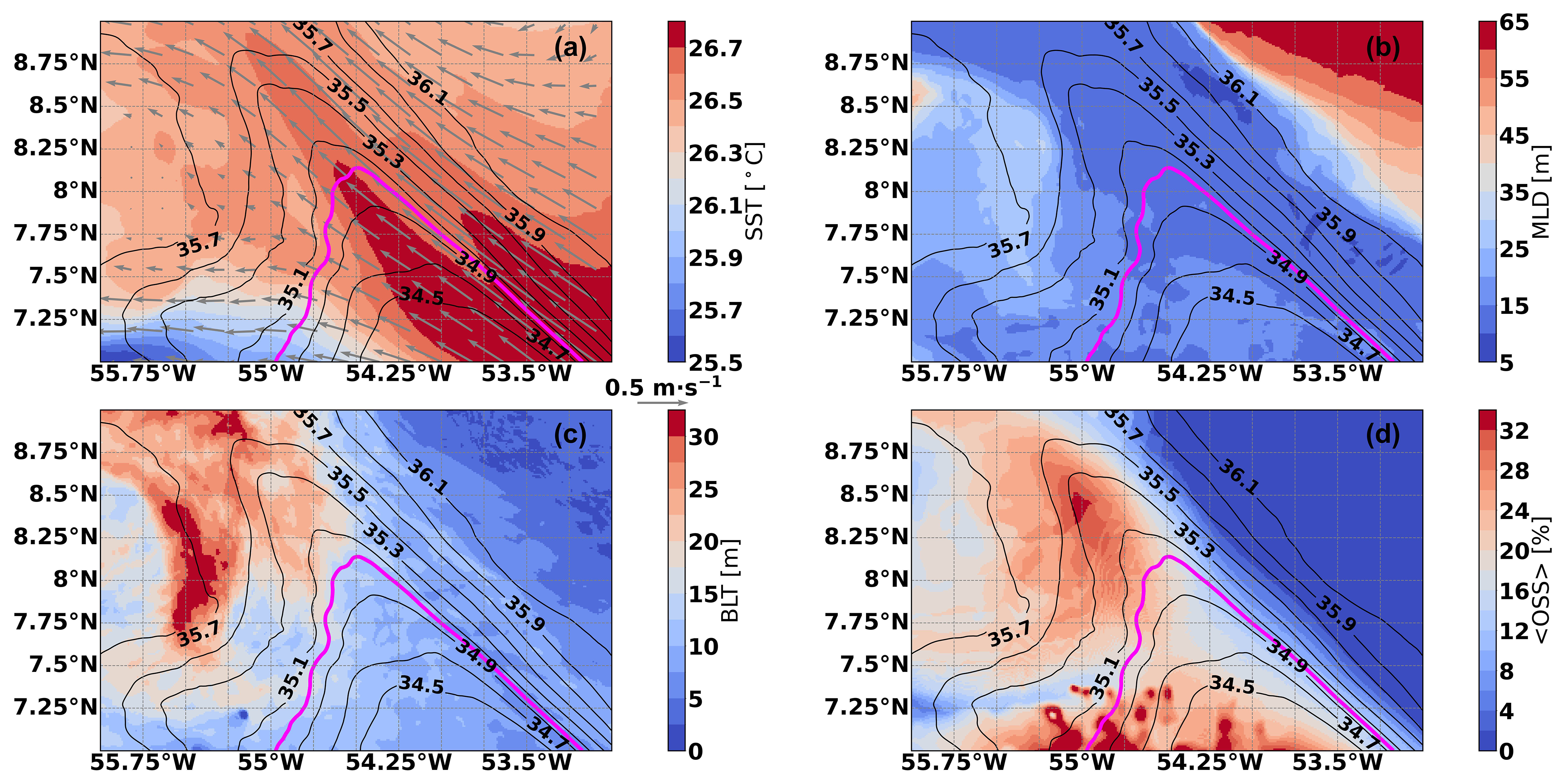 Figure 9February 2020 average of (a) SST (shading) and surface currents (arrows), (b) mixed layer depth (MLD, shading), (c) barrier layer thickness (BLT, shading), and (d) OSS index integrated down to the base of the mixed layer (〈OSS〉, shading). In all panels black contours denote the February 2020 averaged SSS and the magenta contour the mean February 2020 position of the edge of the Amazon plume (35 psu isoline).