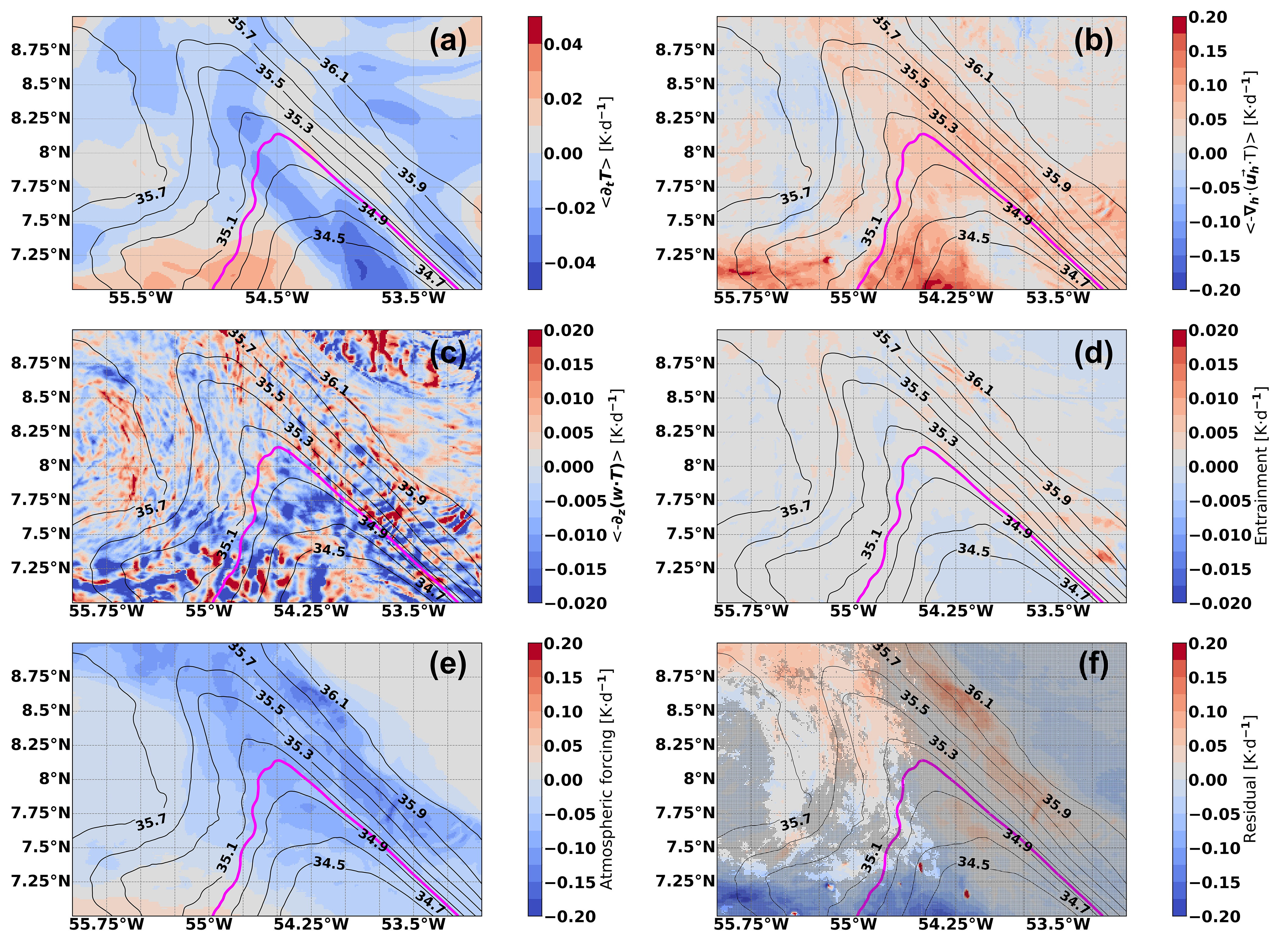 As shown later, the Amazon sub-region is crossed by the fresher Amazon River plume waters, which affect ocean stratification and the SST mesoscale anomaly field in the sub-region. To provide a broader insight on the linkages between SST anomalies and the processes leading to heat redistribution in the Amazon plume, we present a mixed layer heat budget analysis in the Amazon sub-region. Based on observational studies in the region (Reverdin et al., 2021), we set the boundary of the Amazon plume at the 35 psu isoline (Amazon plume waters <35 psu).