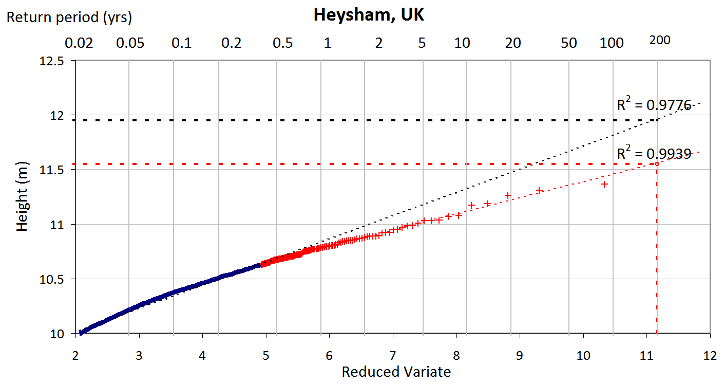 Figure 1Probability extreme tide plot showing its curvature in a 54-year record. Setting a threshold of 50 greatest extremes tides per year (2439 total), the LSQ intercept is 11.95 m ±0.02 m R2=0.9776 (black). At 5 greatest extreme tides per year (242 points) the straighter red section gives an improved LSQ intercept of 11.6 m (red) ±0.009 m R2=0.9939. Location Heysham UK See Sect. 4.1 and Figs. 2 and 3.