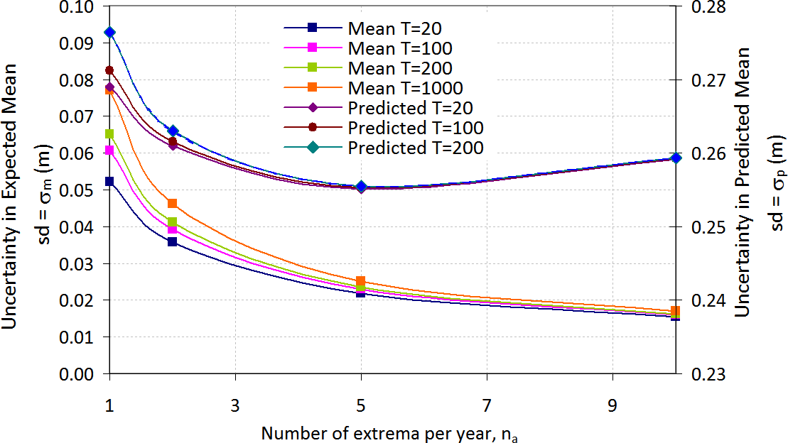As discussed above, selecting only the highest peaks avoids the graph curvature of Fig. 1, improving its accuracy. Therefore, although larger sample values are generally associated with a decrease in variance, in this case the opposite may be true. Figure 2 shows the variation of, the uncertainty of the mean, σm, and uncertainty of a predicted new point, σp , as determined using Eqs. (14) and (15), with nA, the average number of extremes selected per year, indicating σp attains a minimum at a value of na of around five extremes per year. This concurs with the value of five per year found by Robson and Reed (2008) for extreme river flow studies and used by Smith (1986), although this may be coincidental. Nevertheless, since we obtain a minimum variance at the value of na=5, this was adopted for all subsequent results.