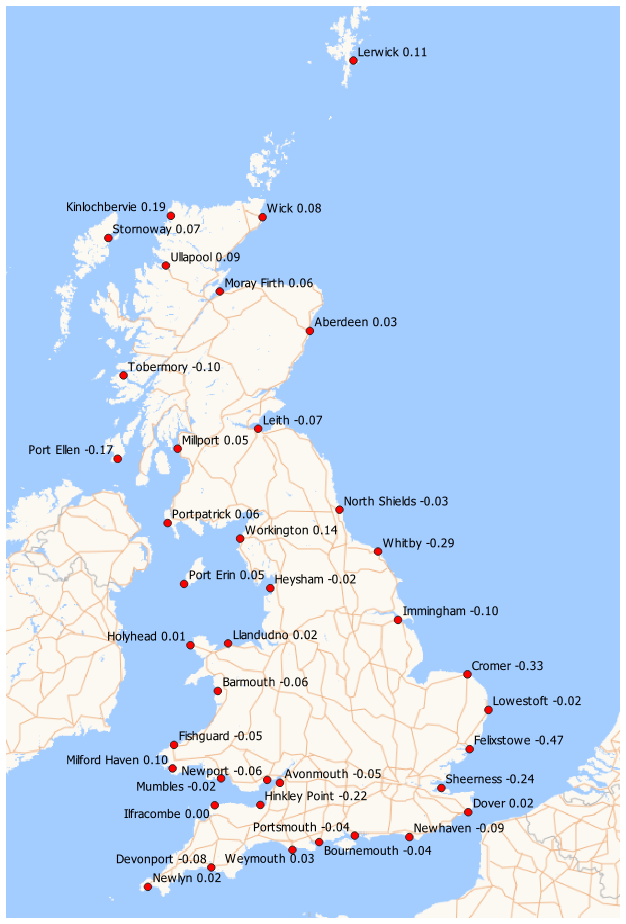Table 1 compares the results of TMAX2009 with EA2011, displaying ESLs in metres above ODN relative to MSL2008 for all 39 ports. The results are shown for each of the return periods of 20, 100, 200, and 1000 years. The column headed SD shows standard deviation for the TMAX2009 ESLs as obtained from the Least Squares Fit using Eq. (16). The column headed “Difference” shows the values returned from TMAX2009 minus those from EA2011. The lower two rows show the mean values and their standard deviations. The mean differences were of the order of centimetres while the standard deviations were of the order of 10 to 20 cm, with both rising for the longer return periods. Figure 3 shows the estimated ESL values for a 100-year return period at 39 UK sites on a map as derived from TMAX2018 rather than from TMAX2009, utilising all of the tidal data examined. The results are discussed in the error analysis in the following section.