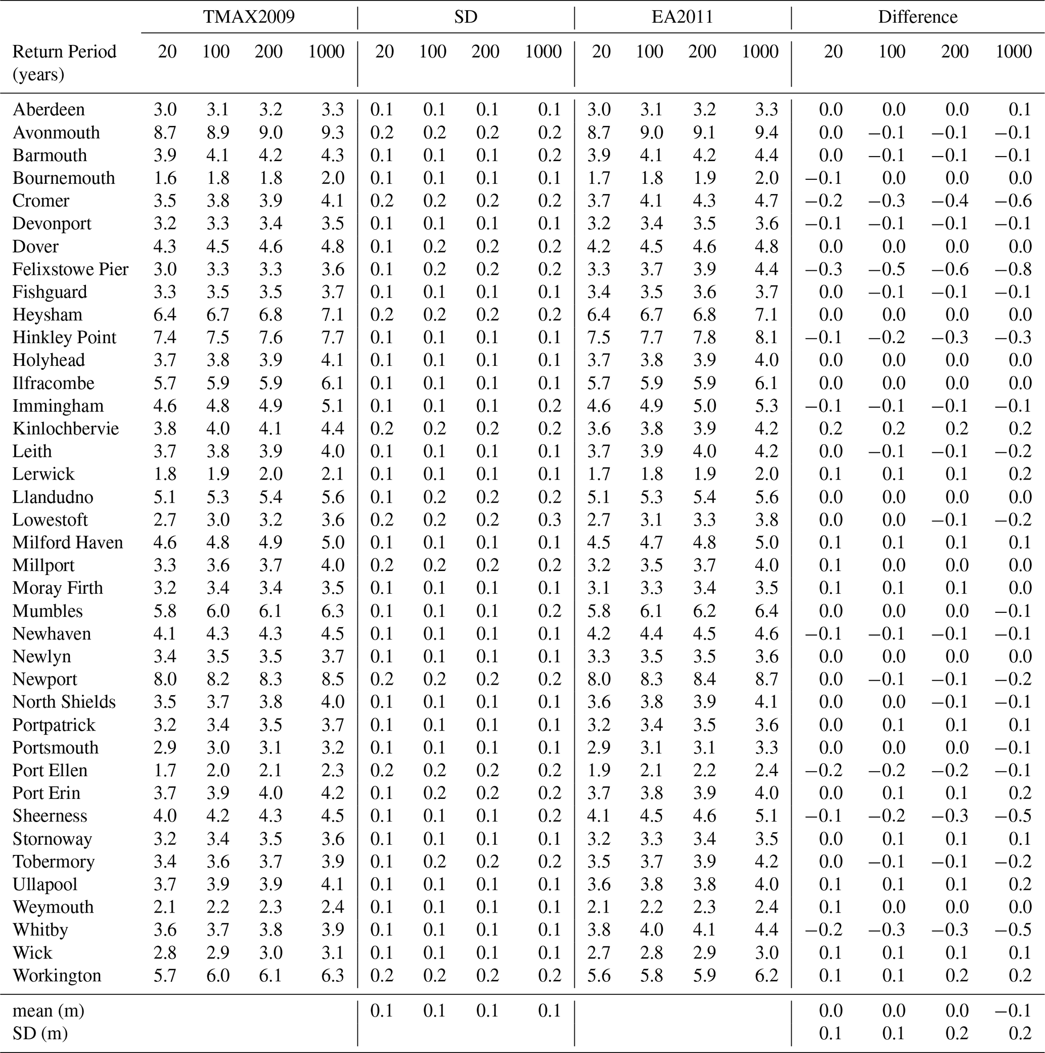 Table 3 shows the mean differences in ESL, and standard deviations of the differences between TMAX and EA2011 and between AMAX and EA2011, while Fig. 4 shows the differences as histograms. With AMAX the mean of the differences was generally slightly positive, indicating marginally higher ESLs as compared to EA2011, whereas with TMAX the ESLs were generally lower, indicating a slight reduction in sea-defence requirements. For AMAX the mean differences were slightly smaller than TMAX, indicating marginally better agreement, perhaps reflecting the use of AMAX in EA2011 at those locations where SSJPM was not used. However, the standard deviation of the difference was much greater than the mean difference, for all return periods listed. The standard deviation of the difference ranged from 0.09 m for the 20-year return period with TMAX2009/2018 to 0.25 m for the 1000 years return period with AMAX. The Students “t” test was used establish the significance of the mean difference values, (α=0.05, 39 pairs, df=38 tails =2), giving a critical value at a 95 % confidence level of tcrit=2.02. Out of sixteen comparisons made, fifteen determined “t” to be considerably smaller than this critical value, the exception being AMAX09 at a 1000-year return period where only a marginal significance was found. Thus, according to the paired t-test the values of the mean difference is not significant. Across all studies for TMAX2009, TMAX2018, AMAX2009 and AMAX2018 and their comparison with EA2011 there were no consistent positive outliers exceeding two standard deviations above the mean. However, there were consistently significant negative outliers, with over two standard deviations below the mean; these were Cromer, Felixstowe and Sheerness. Significantly, these ports had been singled out for discussion of levels in the EA2011 study. The port of Felixstowe consistently gave return levels having the largest significant difference from those of EA2011. A further study using TMAX of tidal records for the nearby port of Harwich, at a distance of only 3 nautical miles from Felixstowe, gave a considerably improved level of agreement of ESLs with the results of EA2011 for Felixstowe, although the implication of this are not clear.