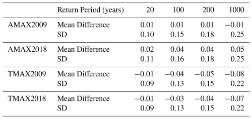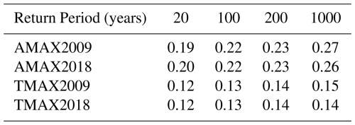 Table 2 shows the standard deviation for each given return period as calculated from the best fit to the source “n” maxima, plotted using Eqs. (8) and (13) and evaluated from those equations listed in Sect. 3.4. The standard deviation is calculated from the expected variance in a new forecast point σp Eq. (15) rather than the smaller variance in the mean σm Eq. (14), as indicated in Sect. 3.5. It can be seen that there is a significant difference between the standard deviation for the two methods AMAX and TMAX, with TMAX significantly outperforming AMAX, reflecting the larger number of points involved in the TMAX method. On average the standard deviations for TMAX were approximately 60 % of those of AMAX which suggest a useful margin of improvement in accuracy. The level of agreement between AMAX and TMAX with the results of EA2011 are now described.