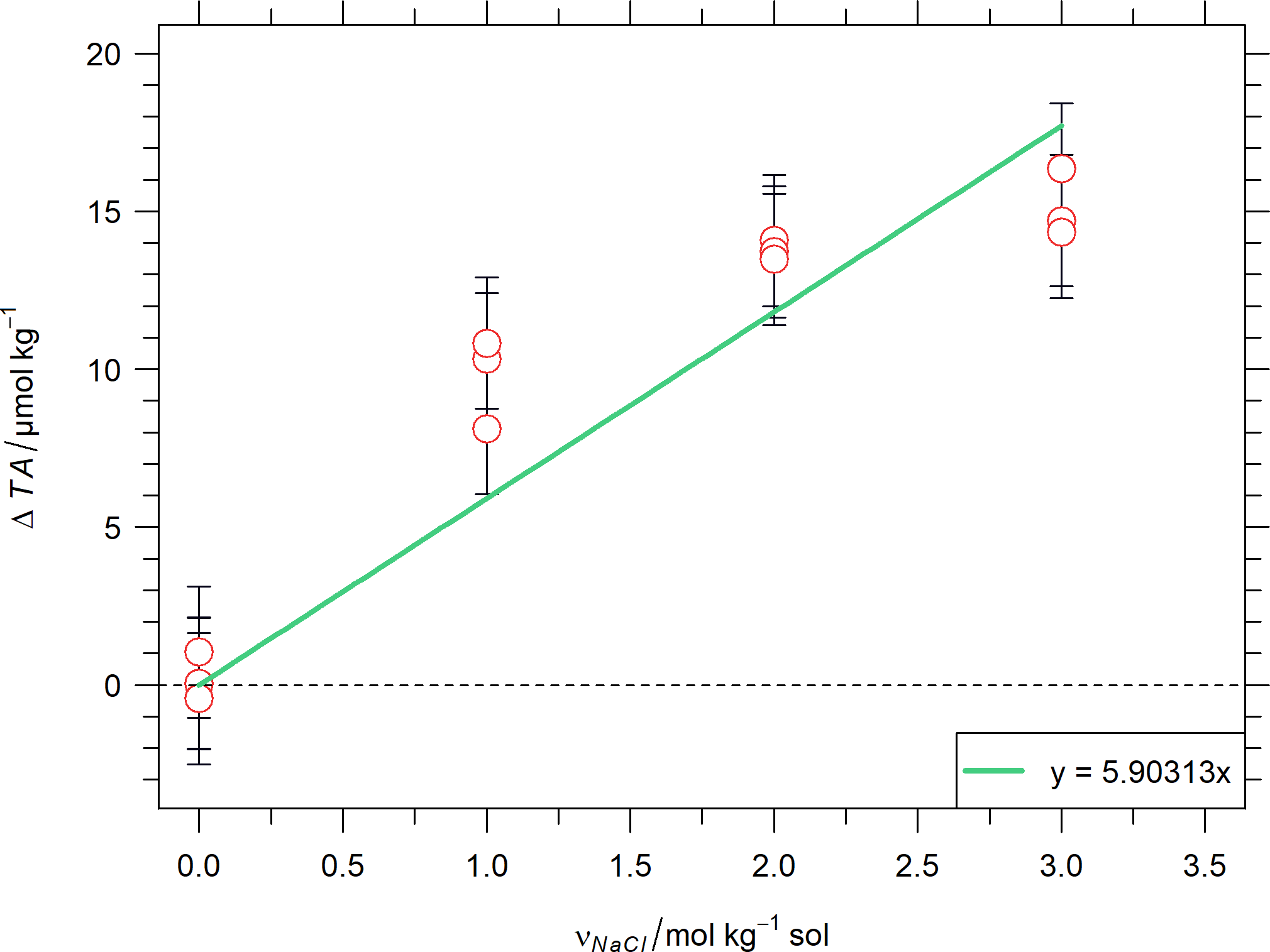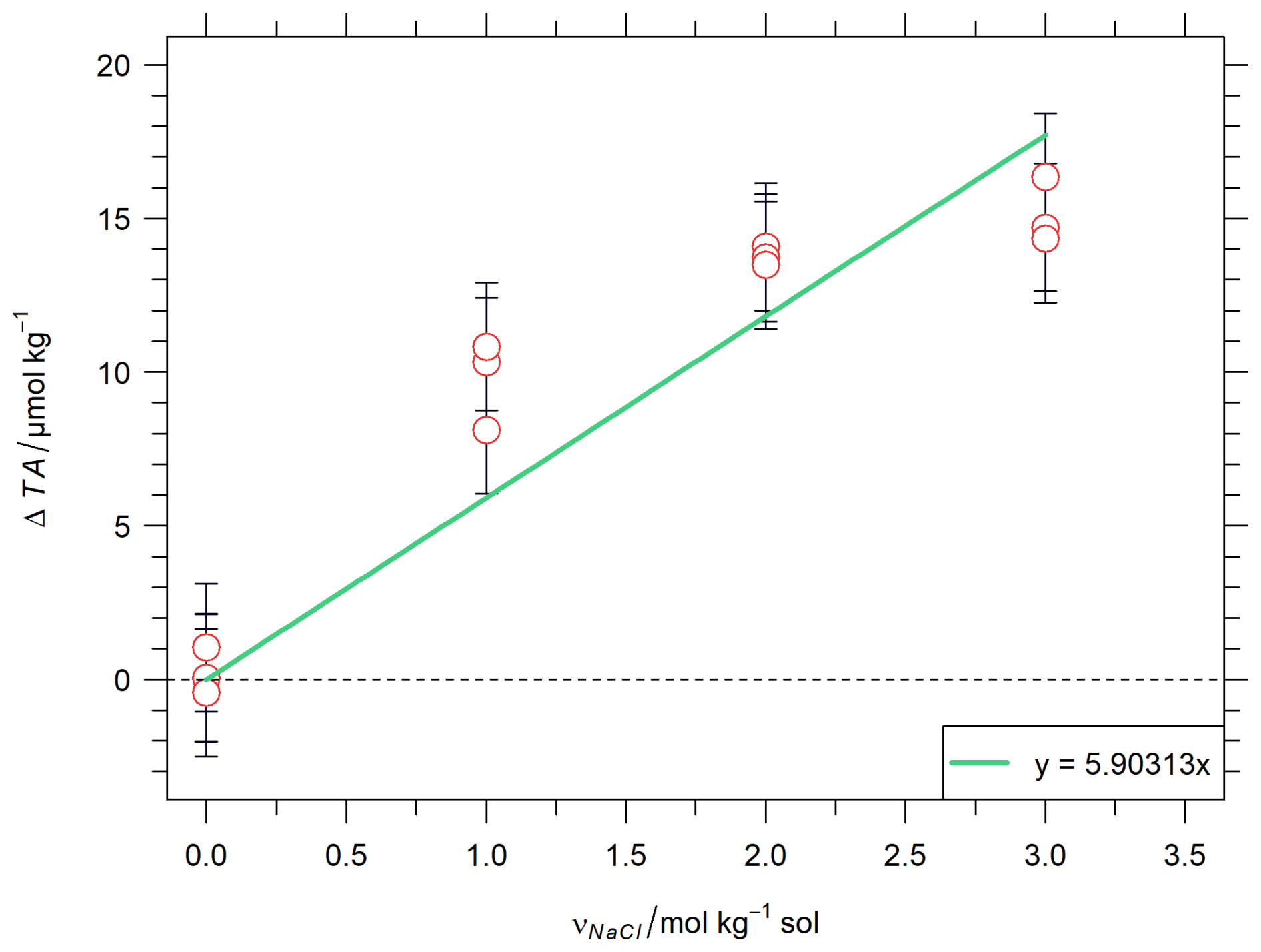 Figure 1Quantification of background alkalinity originating from the NaCl matrix for the artificial reference material. ΔTA represents the difference of total alkalinity between the measured and the theoretical value calculated with Eq. (4). Red circles represent single TA potentiometric measurements with error bars representing their standard uncertainty, and green straight line represents the slope obtained from linear regression passing through the origin.