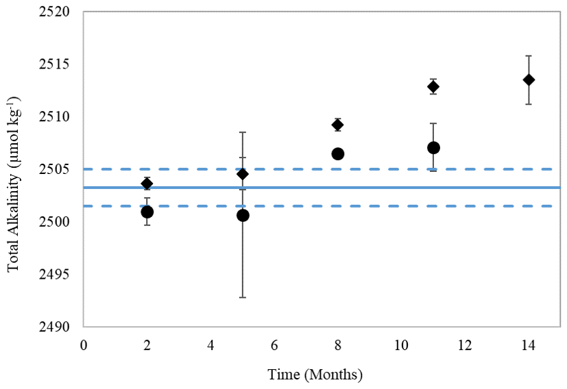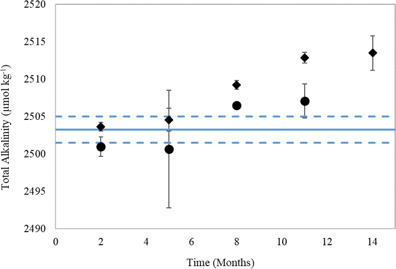 The stability of the stabilized natural seawater and Batch 1 of the artificial reference material, both bottled in ground-neck bottles, were followed by each participant to the inter-laboratory comparison over one year, with total alkalinity measurements performed every three months. For the results obtained at each deadline, Grubb's and Cochran's tests was applied to remove eventual outliers and the median of the remaining values were taken to establish the stability over time. The stability over time of the Batch 2 of the artificial seawater, bottled in glass bottles with screw caps, was followed at LNE on the same schedule.