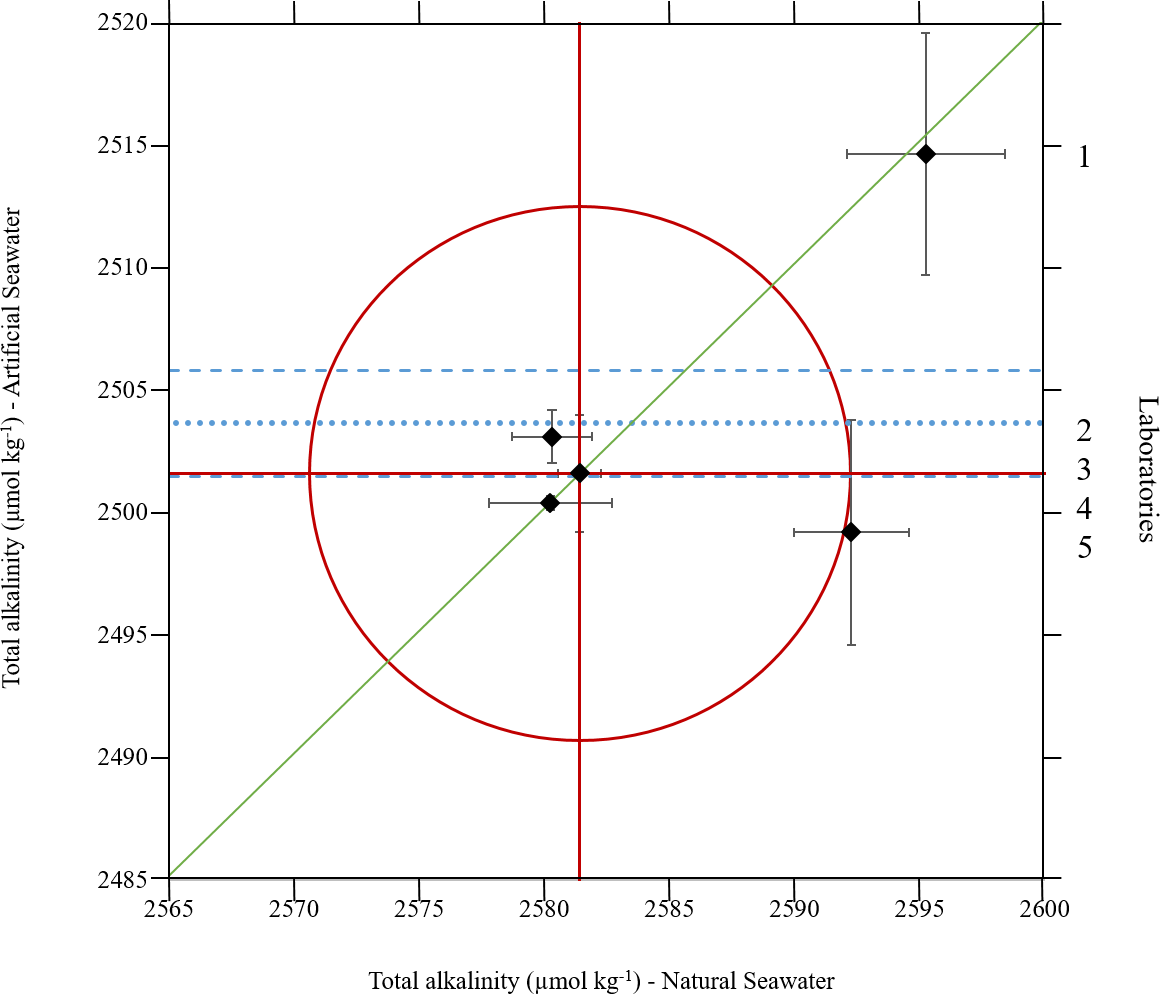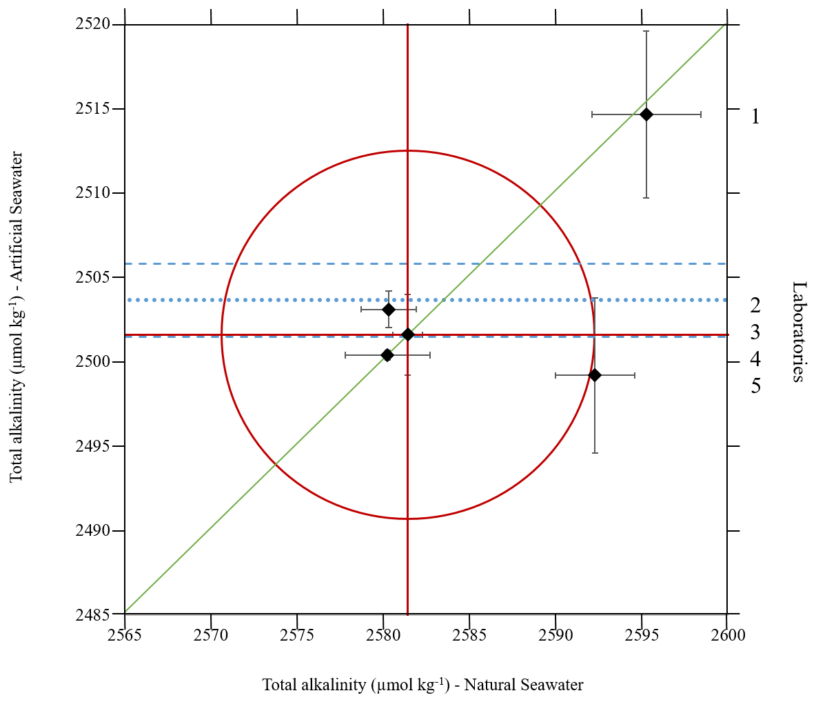 This developed reference material has been tested in an inter-laboratory comparison conducted with five French laboratories conducting TA measurements with the standardized method, being the multi-step potentiometric titration method. Measurements were also performed on a second material, produced similarly to the one from Scripps, being a stabilized natural seawater from the Mediterranean Sea. The second aim of the work presented was, from the inter-laboratory comparison, to study the applicability in quality control for total alkalinity measurements of the artificial and natural solutions developed as reference materials.