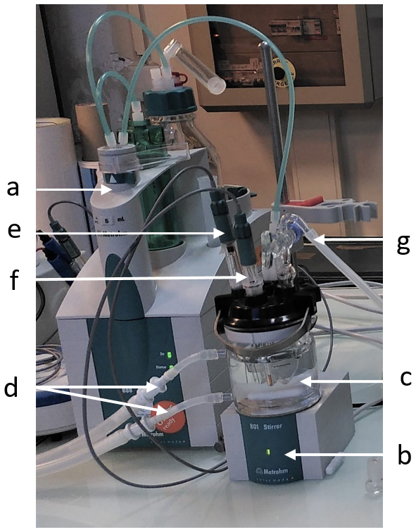 Figure B1Description of LNE's total alkalinity measurement setup. With (a) Burette and titration system, (b) Magnetic stirrer, (c) Thermostated cell, (d) Tubing connected to the water bath, (e) Glass electrode, (f) Temperature probe, and (g) Air inlet for degassing.
