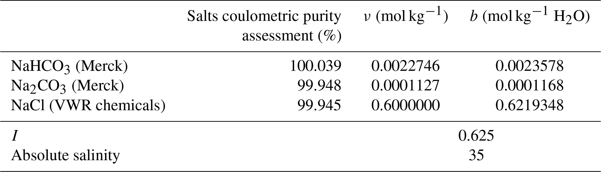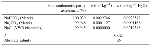 Table 1Targeted composition and information about ionic strength (I) and absolute salinity of the artificial solution for total alkalinity reference material.